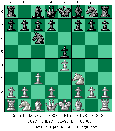 Last move : 1-0 2010 January 15 20:18:32 [Event "FICGS__CHESS__CLASS_B__000089"] [Site "FICGS"] [Date "2009.10.21"] [Round "1"] [White "Geguchadze,Sandro"] [Black "Elsworth,Shannon"] [Result "1-0"] [WhiteElo "1800"] [BlackElo "1800"] 1.e4 e5 2.Nf3 Nc6 3.c3 1-0 This chess game has been lost on time (started : 2009.10.21 2:16:30) Ponziani Opening Player White won this chess game. Follow this game move after move (download)Becoming successful at Chess allows you to discover your own personality. That's what I want for the kids I teach. (Saudin Robovic) Kleine Schachspieler machen Mist, und große Schachspieler machen Mist, aber große machen weniger Mist. (Fritz Sämisch) Preferería tener un Peón que un dedo. (Reuben Fine) Il vaut toujours mieux jouer un plan faux de façon logique que de n'avoir pas de plan du tout. (Victor Kortchnoï) When you stop learning you start dying. (M. Scott Adams)