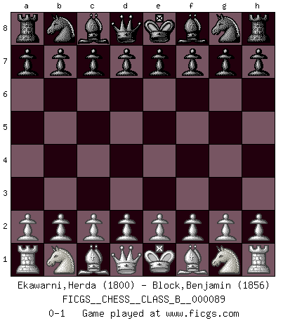 Last move : 0-1 2009 November 30 9:1:35 [Event "FICGS__CHESS__CLASS_B__000089"] [Site "FICGS"] [Date "2009.10.21"] [Round "1"] [White "Ekawarni,Herda"] [Black "Block,Benjamin"] [Result "0-1"] [WhiteElo "1800"] [BlackElo "1856"] 0-1 This chess game has been lost on time (started : 2009.10.21 2:16:30) Player Black won this chess game. Follow this game move after move (download)All my games are real. (Bobby Fischer) Ich war schon mal beim Dopingtest. Da musste ich Urin abgeben, während Dritte zusahen. (Elisabeth Pähtz) El Ajedrez es una guerra en un tablero. El objetivo es aplastar la mente del oponente. (Bobby Fischer) On entre au jeu d'Echecs comme on entre en Religion. Pour le joueur d'Echecs, la partie d'Echecs c'est l'office, la messe, le défilé du 1er Mai, le dépôt de gerbe au Monument aux Morts. C'est un drame sacré. (Michel Roos) To err is human, but to really foul things up requires a computer. (Farmer's Almanac, 1978)