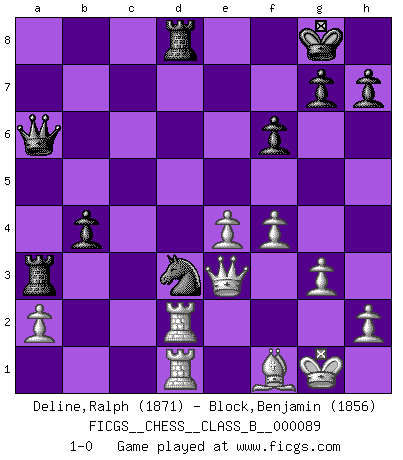 Last move : 1-0 2010 February 15 17:16:29 [Event "FICGS__CHESS__CLASS_B__000089"] [Site "FICGS"] [Date "2009.10.21"] [Round "1"] [White "Deline,Ralph"] [Black "Block,Benjamin"] [Result "1-0"] [WhiteElo "1871"] [BlackElo "1856"] 1.c4 e5 2.g3 Nf6 3.Bg2 d5 4.cxd5 Nxd5 5.Nf3 Nc6 6.O-O Nb6 7.Nc3 Be7 8.d3 O-O 9.Be3 Be6 10.Rc1 f6 11.d4 exd4 12.Nxd4 Nxd4 13.Bxd4 c6 14.Qd3 Qe8 15.Rcd1 Qf7 16.b3 Bb4 17.Qc2 Rfe8 18.e4 Nd7 19.Ne2 c5 20.Bc3 Bxc3 21.Qxc3 Rac8 22.Nf4 c4 23.Nxe6 Qxe6 24.bxc4 Ne5 25.Qa3 Qxc4 26.Qxa7 b5 27.f4 Nd3 28.Rd2 Ra8 29.Qe3 Ra3 30.Rfd1 Qc5 31.Re2 Qc4 32.Bf1 b4 33.R2e1 Rd8 34.Rd2 Qa6 35.Red1 1-0 English Opening Kingside Castling by player White (move 6) Kingside Castling by player Black (move 8) Player White won this chess game. Follow this game move after move (download)I'd rather have a Pawn than a finger. (Reuben Fine) Das Schach ist nichts für kleine Geister, es beansprucht einen vollen Mann, der sich nicht sklavisch an das Überlieferte hält, sondern selbständig die Tiefen des Spiels zu ergründen sucht. (Wilhelm Steinitz) Nunca antes ha habido un jugador de Ajedrez con tal conocimiento a fondo de las complejidades del juego y una inmensa voluntad absolutamente indomable de ganar. Yo pienso que Fischer es el jugador mas grande que jamás haya existido. (Lisa Lane) La vie est comme un jeu d'échecs : nous esquissons un plan, mais celui-ci est tributaire de ce que daignent faire l'adversaire aux échecs et le destin dans la vie. (Arthur Schopenhauer) To be champion requires more than simply being a strong player; one has to be a strong human being as well. (Anatoly Karpov)