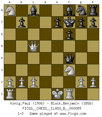 Last move : 1-0 2010 January 28 21:21:54 [Event "FICGS__CHESS__CLASS_B__000089"] [Site "FICGS"] [Date "2009.10.21"] [Round "1"] [White "Konig,Paul"] [Black "Block,Benjamin"] [Result "1-0"] [WhiteElo "1906"] [BlackElo "1856"] 1.e4 c5 2.f4 d5 3.exd5 Qxd5 4.Nc3 Qd6 5.Nf3 Nc6 6.Bb5 Qxf4 7.d4 Qc7 8.d5 a6 9.dxc6 axb5 10.Nd5 Qxc6 11.Bf4 f6 12.Nc7+ Kf7 13.Nxa8 Qe4+ 14.Qe2 Qxf4 15.Rf1 Kg6 16.Qxb5 Kf7 17.Qxc5 1-0 Sicilian : Grand Prix attack Player White won this chess game. Follow this game move after move (download)Before the endgame, the Gods have placed the middle game. (Siegbert Tarrasch) Die jungen Leute sollen verstehen, dass sie noch etwas von mir lernen können und müssen. (Viktor Kortschnoi) El jugador de combinación piensa hacia adelante; comienza de la posición dada y trabaja las movidas contundentes en su mente. (Emanuel Lasker) Le jeu d'échecs est comme rejeté hors du temps. (Antoine de Saint-Exupéry) Secret operations are essential in war; upon them the army relies to make its every move. (Sun Tzu)