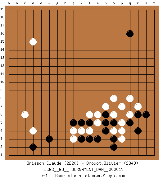 Last move : 0-1 2009 December 1 8:11:45 [Event "FICGS__GO__TOURNAMENT_DAN__000019 "] [Site "FICGS"] [Date "2009.10.21"] [Round "1"] [Black "Brisson,Claude "] [White "Drouot,Olivier "] [Result "0-1"] [Rating 1 "2220"] [Rating 2 "2349"] 1.q16 d4 2.f3 c6 3.r4 o4 4.d2 d15 5.m3 q6 6.o3 p3 7.o2 p4 8.r6 j3 9.n4 o6 10.q7 m5 11.l5 l4 12.n5 r7 13.s6 l6 14.k5 m6 15.k3 k4 16.l3 j4 17.n6 n7 18.o5 p5 19.o7 p7 20.p6 q8 21.q5 o6 22.j5 o8 0-1 Here are the names of the openings (joseki) played in the four corners : Corner d4 : d4 f3Hoshi (Hwajeom, Seongjeom, Xingwei`) 4-4 Point. The star or hoshi (4-4) point, emphasizing influence at the potential expense of territory.Ikken Kakari (Hankan Keolch'im, Yi Gua`jiao~, 1-Space Low Approach). Black 2 is the standard approach move to the 4-4. Corner q4 : r4 o4Komoku (Somok, Xiao~mu`) 3-4 Point. The komoku (3-4) point is the traditional corner enclosure move..Nikken Takagakari (Dukan Nop'dakeolch'im, E`r Gaojia, 2-Space High Approch). The great master Honinbo Shuei (1852-1906) favored the two-space high (niken taka-gakari) approach, especially in two stone handicap games. This approach move was very popular in the 1910s. Wu Qingyuan = Go Seigen frequently played this way, considering it a good "whole board" approach. In recent years, O Rissei has often used the two-space high approach. Player White won this Go (weiqi, baduk) game.Follow this game move after move (download ) If you don't know ladders, don't play go. (Anonymous) When it is a question of money, everybody is of the same religion. (Voltaire)