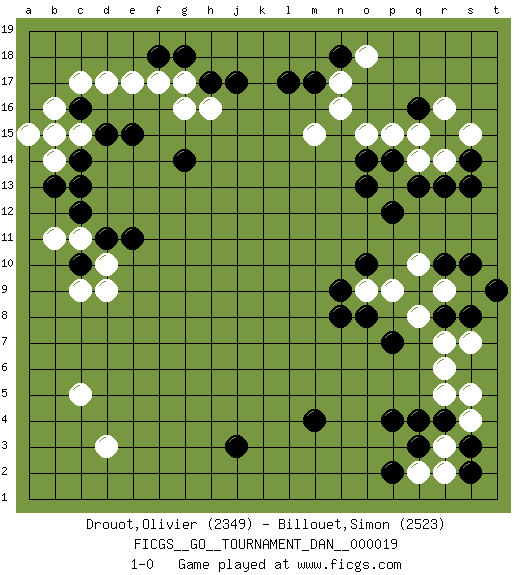 Last move : 1-0 2009 December 7 2:16:20 [Event "FICGS__GO__TOURNAMENT_DAN__000019"] [Site "FICGS"] [Date "2009.10.21"] [Round "1"] [Black "Drouot,Olivier"] [White "Billouet,Simon"] [Result "1-0"] [Rating 1 "2349"] [Rating 2 "2523"] 1.q16 d17 2.p4 d3 3.j3 c5 4.r4 r14 5.q13 q14 6.p14 p13 7.s14 p15 8.o14 q15 9.r13 s15 10.s13 r16 11.p12 o15 12.o13 m15 13.l17 n17 14.h17 g16 15.f18 g17 16.g18 h16 17.j17 e17 18.n18 o18 19.m17 n16 20.e15 c15 21.c14 b14 22.b15 b16 23.d15 a15 24.c16 b15 25.c13 c11 26.g14 f17 27.b13 c17 28.e11 d9 29.c10 d10 30.d11 b11 31.c12 c9 32.m4 q8 33.o8 r6 34.r10 s4 35.s3 r9 36.s10 o9 37.n9 p9 38.n8 q10 39.o10 s5 40.s8 s9 41.t9 s7 42.r8 r3 43.q3 r2 44.s2 q2 45.p2 r5 46.q4 r7 47.q9 r9 48.p7 1-0 Here are the names of the openings (joseki) played in the four corners : Corner d4 : d3 j3 Komoku (Somok, Xiao~mu`) 3-4 Point. The komoku (3-4) point is the traditional corner enclosure move.. Corner q16 : q16 r14 Hoshi (Hwajeom, Seongjeom, Xingwei`) 4-4 Point. The star or hoshi (4-4) point, emphasizing influence at the potential expense of territory. Ikken Kakari (Hankan Keolch'im, Yi Gua`jiao~, 1-Space Low Approach). White 2 is the standard approach move to the 4-4. Corner d16 : d17 h17 Komoku (Somok, Xiao~mu`) 3-4 Point. The komoku (3-4) point is the traditional corner enclosure move.. Player Black won this Go (weiqi, baduk) game. Follow this game move after move (download)When your opponent has two weak groups, attack them both at once. (Anonymous) Happy endings are just stories that haven't finished yet. (Jane Smith in Mr & Mrs Smith)