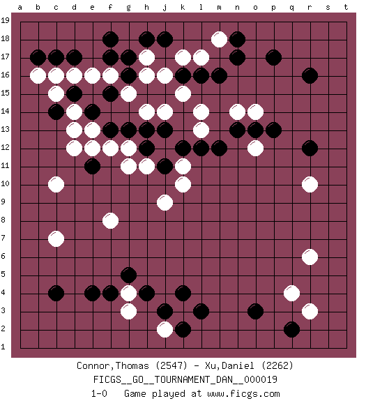 Last move : 1-0 2009 December 20 12:24:29 [Event "FICGS__GO__TOURNAMENT_DAN__000019"] [Site "FICGS"] [Date "2009.10.21"] [Round "1"] [Black "Connor,Thomas"] [White "Xu,Daniel"] [Result "1-0"] [Rating 1 "2547"] [Rating 2 "2262"] 1.r16 q4 2.c4 d16 3.p17 r10 4.o3 r6 5.q2 r3 6.l3 c10 7.e4 c7 8.f17 h17 9.c17 c16 10.d17 e16 11.f18 g15 12.e11 d12 13.h4 g4 14.f4 k3 15.j3 l17 16.r12 g3 17.g5 j2 18.k4 f8 19.k2 j9 20.j11 k11 21.k12 k10 22.j13 h11 23.h12 g11 24.m12 g12 25.g13 e13 26.n17 o12 27.f13 f12 28.e14 e12 29.f15 f16 30.c14 b16 31.b17 d14 32.d15 d13 33.g16 h16 34.g17 h14 35.h13 c15 36.k16 k17 37.m16 m18 38.n18 k15 39.l16 j16 40.h18 l14 41.n13 n14 42.o13 l13 43.l12 o14 44.p13 j14 45.j18 1-0 Here are the names of the openings (joseki) played in the four corners : Corner q4 : q4 o3 Hoshi (Hwajeom, Seongjeom, Xingwei`) 4-4 Point. The star or hoshi (4-4) point, emphasizing influence at the potential expense of territory. Ikken Kakari (Hankan Keolch'im, Yi Gua`jiao~, 1-Space Low Approach). Black 2 is the standard approach move to the 4-4. Corner d16 : d16 f17 Hoshi (Hwajeom, Seongjeom, Xingwei`) 4-4 Point. The star or hoshi (4-4) point, emphasizing influence at the potential expense of territory. Ikken Kakari (Hankan Keolch'im, Yi Gua`jiao~, 1-Space Low Approach). Black 2 is the standard approach move to the 4-4. Player Black won this Go (weiqi, baduk) game. Follow this game move after move (download)Keshi is worth as much as an invasion ! (Anonymous) The best teachers teach from the heart, not from the book. (Author unknown)