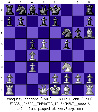 Last move : 1-0 2006 November 13 10:48:16 [Event "FICGS__CHESS__THEMATIC_TOURNAMENT__000016"] [Site "FICGS"] [Date "2006.09.30"] [Round "1"] [White "Vasquez,Fernando"] [Black "Smith,Glenn"] [Result "1-0"] [WhiteElo "1581"] [BlackElo "1200"] 1.d4 g6 2.c4 Bg7 3.Nc3 c5 4.d5 Bxc3+ 5.bxc3 f5 6.Nf3 Nf6 7.Bh6 1-0 This chess game has been lost on time (started : 2006.09.30 18:9:9) Beefeater defense Player White won this chess game. Follow this game move after move (download)A great player and a great example for many. His book My 60 Memorable Games had a big impact on me. It is a shame he didn't continue to enrich the world of chess with his unparalleled understanding after 1972. (Jan Timman, about Bobby Fischer's death) Es tut gut, die Entwicklungsperiode von, [...] demokratischem Geist durchdringen zu lassen. Wie undemokratisch wäre es doch beispielsweise, den einen Offizier große Spaziertouren vornehmen zu lassen, während die anderen zu Hause säßen und sich entsetzlich langweilten. (Aaron Nimzowitsch) El Ajedrez es un expediente tonto que hace creer a la gente inactiva que hacen una cosa muy astuta cuando solamente estan perdiendo su tiempo. (George Bernard Shaw) A chaque perte on perd un peu de soi. (Joël Lautier) Computers are like Old Testament gods; lots of rules and no mercy. (Joseph Campbell)
