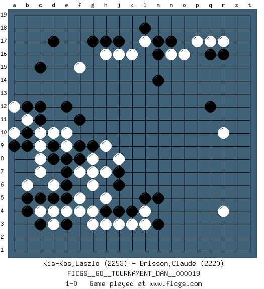 Last move : 1-0 2010 February 10 0:8:57 [Event "FICGS__GO__TOURNAMENT_DAN__000019"] [Site "FICGS"] [Date "2009.10.21"] [Round "1"] [Black "Kis-Kos,Laszlo"] [White "Brisson,Claude"] [Result "1-0"] [Rating 1 "2253"] [Rating 2 "2220"] 1.r16 r4 2.d17 c4 3.c15 l17 4.j17 p17 5.n17 n16 6.m16 o16 7.m17 r17 8.q16 q17 9.q12 k16 10.l18 j16 11.h17 r10 12.m14 h16 13.g17 f15 14.e3 g3 15.e5 d6 16.h4 g4 17.g5 h3 18.j4 j3 19.k4 l3 20.m5 c10 21.c12 e10 22.m3 k3 23.e12 l4 24.l5 f4 25.c3 e4 26.b4 d3 27.c5 d4 28.d5 f5 29.e6 c7 30.d8 c8 31.d9 d10 32.f8 h5 33.j6 g6 34.h8 h7 35.j7 f7 36.e7 g8 37.g9 g7 38.f9 e9 39.e8 h9 40.f11 b11 41.b12 b6 42.b5 j8 43.b9 c9 44.b10 a10 45.c11 a12 46.a9 1-0 Here are the names of the openings (joseki) played in the four corners : Corner q16 : r16 l17 Komoku (Somok, Xiao~mu`) 3-4 Point. The komoku (3-4) point is the traditional corner enclosure move.. Corner d4 : c4 e3 Komoku (Somok, Xiao~mu`) 3-4 Point. The komoku (3-4) point is the traditional corner enclosure move.. Ikken Kakari (Hankan Keolch'im, Yi Gua`jiao~, 1-Space Low Pincer). The small knight move is the basic approach move to the 3-4 point stone. It has been continually used for over four centuries. There are limitless variations, with new moves constantly being discovered. Black 2 opens the door to a treaure store of joseki. Player Black won this Go (weiqi, baduk) game. Follow this game move after move (download)Answer the keima with a kosumi. (Anonymous) I fear not the man who has practiced 10,000 kicks once, but I fear the man who has practiced one kick 10,000 times. (Bruce Lee)