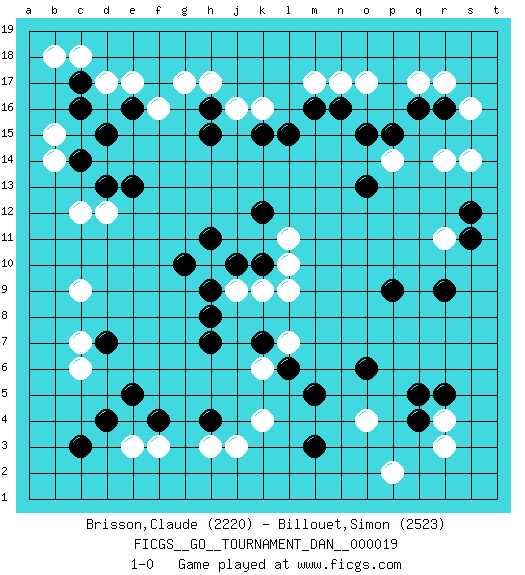Last move : 1-0 2010 March 4 9:37:13 [Event "FICGS__GO__TOURNAMENT_DAN__000019"] [Site "FICGS"] [Date "2009.10.21"] [Round "1"] [Black "Brisson,Claude"] [White "Billouet,Simon"] [Result "1-0"] [Rating 1 "2220"] [Rating 2 "2523"] 1.q16 d17 2.c3 r3 3.q4 r4 4.q5 p2 5.r5 o4 6.r9 c12 7.d4 o17 8.m3 r14 9.p15 r17 10.r16 q17 11.n16 n17 12.m16 r11 13.p9 p14 14.o15 c9 15.d15 f16 16.c17 c18 17.c16 b18 18.d13 d12 19.e13 j16 20.s12 s14 21.s11 s16 22.o13 c6 23.m5 f3 24.e5 j3 25.d7 c7 26.h4 h3 27.f4 e3 28.o6 l9 29.k10 k9 30.j10 j9 31.h9 k6 32.h7 h10 33.h8 l10 34.h11 k4 35.g10 m17 36.h16 h17 37.h15 g17 38.k15 k16 39.l15 l11 40.k12 b14 41.e16 e17 42.c14 b15 43.k7 l7 44.l6 1-0 This go game has been lost on time (started : 2009.10.21 23:55:8) Here are the names of the openings (joseki) played in the four corners : Corner q4 : r3 q4 San-San (Sam-Sam, San-San) 3-3 Point. The San-San (3-3) point, emphasizing territory at the expense of influence. Kata-tsuki (shoulder hit). The shoulder-hit is the traditional answer to the 3-3. The direction of White 3 depends on the positions on the side. Crawling once may be the premise for a follow-up move of sliding with a knight's move in the opposite direction. If White plays 3 at 3-4 (to the right), the follow-on knight's move is then played at the top (e.g. 3-4, 4-5, 5-2). White's knight's move reduces territory potential on the side it is played. Corner q16 : q16 o17 Hoshi (Hwajeom, Seongjeom, Xingwei`) 4-4 Point. The star or hoshi (4-4) point, emphasizing influence at the potential expense of territory. Ikken Kakari (Hankan Keolch'im, Yi Gua`jiao~, 1-Space Low Approach). White 2 is the standard approach move to the 4-4. Player Black won this Go (weiqi, baduk) game. Follow this game move after move (download)You can hide nothing on the goban. (Pierre Audouard) Games, world of games... There's always an opponent, and there's always a victim. (Revolver, movie)