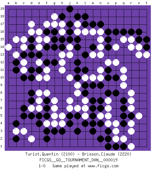 Last move : 1-0 2010 February 3 17:36:3 [Event "FICGS__GO__TOURNAMENT_DAN__000019"] [Site "FICGS"] [Date "2009.10.21"] [Round "1"] [Black "Turlot,Quentin"] [White "Brisson,Claude"] [Result "1-0"] [Rating 1 "2100"] [Rating 2 "2220"] 1.p16 d17 2.c5 r3 3.d14 f17 4.e4 r14 5.r16 q11 6.m17 c12 7.c10 e12 8.f14 e10 9.d8 l16 10.l17 k16 11.h14 k17 12.c13 c11 13.d10 h11 14.k14 m16 15.n17 n16 16.o16 m13 17.k12 j10 18.l11 k4 19.l9 j7 20.m14 n14 21.l13 n13 22.q4 r4 23.q5 p2 24.n4 r6 25.q6 r7 26.p8 q9 27.g3 o6 28.q7 r8 29.n7 o4 30.n6 n5 31.m5 o5 32.m3 n3 33.m4 l6 34.m6 e6 35.d5 e8 36.d7 e7 37.o3 p3 38.n2 p4 39.j5 h5 40.j4 h4 41.h3 j6 42.k5 c15 43.b14 b15 44.s15 s14 45.e11 f10 46.f12 c14 47.d13 b13 48.b12 a14 49.b11 c3 50.b4 d2 51.f2 b3 52.b2 f4 53.f3 o7 54.o8 n8 55.n9 m8 56.l8 m10 57.m9 l10 58.k10 k9 59.k11 n10 60.o10 n11 61.k18 l7 62.m7 f11 63.d11 h13 64.g12 h12 65.g14 j14 66.j15 j13 67.k15 h16 68.h15 j18 69.l18 g4 70.o11 o12 71.h18 h17 72.j19 g18 73.j17 l5 74.l4 k6 75.k3 d6 76.c6 q15 77.q16 r15 78.s16 k8 79.f5 g6 80.o14 p14 81.o15 p12 82.t14 t13 83.t15 s13 84.j16 n15 85.e5 g5 86.o2 e15 87.p1 q2 88.f6 g7 89.f7 f8 90.d15 d16 91.f16 e16 92.g16 g17 93.r5 s5 94.p10 q10 95.q1 r1 96.o1 e14 97.e13 f15 98.g15 1-0 Here are the names of the openings (joseki) played in the four corners : Corner d16 : d17 d14 Komoku (Somok, Xiao~mu`) 3-4 Point. The komoku (3-4) point is the traditional corner enclosure move.. Nikken Takagakari (Dukan Nop'dakeolch'im, E`r Gaojia, 2-Space High Approch). The great master Honinbo Shuei (1852-1906) favored the two-space high (niken taka-gakari) approach, especially in two stone handicap games. This approach move was very popular in the 1910s. Wu Qingyuan = Go Seigen frequently played this way, considering it a good "whole board" approach. In recent years, O Rissei has often used the two-space high approach. Corner q16 : p16 r14 Takamoku (Gomok, Gaomu`) 5-4 Point. The takamoku (high) point (5-4). With its emphasis on influence, the 5-4 point complements the 4-4 (hoshi) point in creating an influence-oriented fuseki. Corner q4 : r3 l9 San-San (Sam-Sam, San-San) 3-3 Point. The San-San (3-3) point, emphasizing territory at the expense of influence. Player Black won this Go (weiqi, baduk) game. Follow this game move after move (download)Learn the eye-stealing tesuji. (Anonymous) I'm extremely disappointed. I send you out for exciting, new designer drugs, you come back with tomato sauce. (Gregory House, House M.D.)