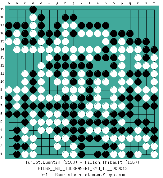 Last move : 0-1 2009 November 26 0:52:42 [Event "FICGS__GO__TOURNAMENT_KYU_II__000013"] [Site "FICGS"] [Date "2009.10.22"] [Round "1"] [Black "Turlot,Quentin"] [White "Pillon,Thibault"] [Result "0-1"] [Rating 1 "2100"] [Rating 2 "1567"] 1.q16 d3 2.c16 r4 3.j16 c9 4.p4 p3 5.q4 q3 6.r5 r3 7.o4 n3 8.q6 r14 9.q11 p14 10.r15 r9 11.s14 r13 12.s11 o9 13.s13 o11 14.q9 p12 15.o16 q10 16.r10 p10 17.q8 c14 18.e16 e14 19.c5 e4 20.c7 e8 21.e6 h3 22.b3 g14 23.g16 m16 24.o13 o14 25.n14 n15 26.o15 m14 27.n13 p13 28.m13 l14 29.m11 m10 30.l10 m9 31.k12 j14 32.l9 m8 33.l8 m7 34.j10 g10 35.h13 h14 36.f12 g12 37.g11 f11 38.g13 f13 39.h12 e12 40.c2 d2 41.l3 l4 42.k3 h17 43.g17 m4 44.h2 j2 45.j3 g2 46.h4 g3 47.j5 k6 48.f5 l13 49.l12 h11 50.k13 k14 51.g12 h10 52.f10 e11 53.f9 g8 54.g9 h9 55.h8 j8 56.h7 j9 57.j7 f8 58.j11 j13 59.j12 e9 60.n11 n10 61.o12 r12 62.r11 p11 63.m17 s12 64.l17 e5 65.e7 f6 66.f7 g6 67.g7 g5 68.g4 f4 69.k5 l6 70.j6 b15 71.a16 b16 72.b17 b8 73.a7 d17 74.c17 d16 75.d15 e15 76.e17 d18 77.c15 b14 78.e18 t13 79.s15 s9 80.r8 s8 81.s7 t11 82.s4 s3 83.s5 k16 84.k17 h16 85.h18 j17 86.j18 h15 87.k1 c3 88.b2 c4 89.b4 j1 90.k2 h1 91.o2 o3 92.n2 p2 93.m3 p5 94.o6 n4 95.o5 p7 96.p6 d5 97.c6 b7 98.b6 p15 99.p16 n16 100.n17 l16 101.t8 t9 102.t7 t10 103.t3 t2 104.t4 s2 105.f15 g15 106.c8 b9 107.q7 o7 108.a8 a9 109.a6 a15 110.a17 d14 111.d19 f14 112.f16 o1 113.m1 n6 114.d9 d8 115.d10 c10 116.d11 c11 117.n5 c1 118.b1 d1 119.m5 k9 120.l5 k10 121.m6 l7 122.k8 e10 123.k7 k11 124.l11 n7 125.t14 t12 126.s1 r1 127.q1 t1 128.p8 o8 129.q15 q14 130.j4 p1 131.n1 d6 132.d7 h5 133.h6 f5 134.pass p9 135.k4 pass 136.pass pass 137.pass pass 138.pass pass 139.pass pass 140.pass pass 0-1 Here are the names of the openings (joseki) played in the four corners : Corner q4 : r4 p4 Komoku (Somok, Xiao~mu`) 3-4 Point. The komoku (3-4) point is the traditional corner enclosure move.. Ikken Takagakari (Hankan Nop'dakeolch'im, Yi Gaogua`jiao~, 1-Space High Approach). The 5-4 approach move has become more popular in modern times, as modern Go emphasizes speed and influence. Corner q16 : q16 r14 Hoshi (Hwajeom, Seongjeom, Xingwei`) 4-4 Point. The star or hoshi (4-4) point, emphasizing influence at the potential expense of territory. Ikken Kakari (Hankan Keolch'im, Yi Gua`jiao~, 1-Space Low Approach). White 2 is the standard approach move to the 4-4. Player White won this Go (weiqi, baduk) game. Follow this game move after move (download)Those who are good at winning, don't usually fight. (Zhang) Statistics can be made to prove anything - even the truth. (Author unknown)