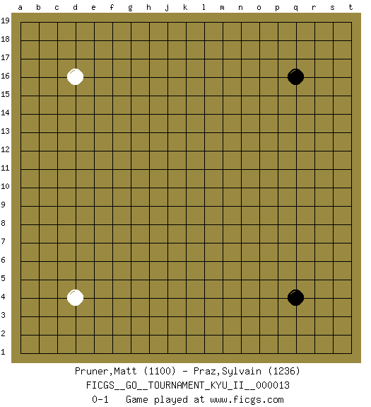 Last move : 0-1 2009 November 24 8:44:10 [Event "FICGS__GO__TOURNAMENT_KYU_II__000013"] [Site "FICGS"] [Date "2009.10.22"] [Round "1"] [Black "Pruner,Matt"] [White "Praz,Sylvain"] [Result "0-1"] [Rating 1 "1100"] [Rating 2 "1236"] 1.q16 d16 2.q4 d4 0-1 This go game has been lost on time (started : 2009.10.22 0:16:58) Here are the names of the openings (joseki) played in the four corners : Corner d4 : d4 0-1 Hoshi (Hwajeom, Seongjeom, Xingwei`) 4-4 Point. The star or hoshi (4-4) point, emphasizing influence at the potential expense of territory. Player White won this Go (weiqi, baduk) game. Follow this game move after move (download)Six eyes in a rectangle are alive. (Anonymous) The Internet isn't free. It just has an economy that makes no sense to capitalism. (Brad Shapcott)