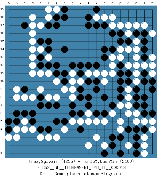 Last move : 0-1 2009 November 26 17:57:49 [Event "FICGS__GO__TOURNAMENT_KYU_II__000013"] [Site "FICGS"] [Date "2009.10.22"] [Round "1"] [Black "Praz,Sylvain"] [White "Turlot,Quentin"] [Result "0-1"] [Rating 1 "1236"] [Rating 2 "2100"] 1.r16 d16 2.q4 d4 3.f17 d14 4.l17 g3 5.q10 d11 6.k4 p17 7.p15 r17 8.o16 q16 9.q15 r15 10.s16 s17 11.s15 r14 12.s14 r13 13.s13 r12 14.s11 r11 15.s10 r10 16.r9 q9 17.q11 s9 18.r8 s12 19.s8 t11 20.t9 p13 21.q13 q12 22.t10 t12 23.p11 o11 24.p12 o12 25.p10 q14 26.o14 o13 27.n14 q7 28.p9 q8 29.p8 p7 30.n8 o6 31.n6 n5 32.m6 m5 33.o7 p5 34.r4 r6 35.s6 s5 36.s7 r5 37.o3 l5 38.m12 m11 39.m10 l11 40.l12 n10 41.m9 l6 42.l7 k7 43.l8 m3 44.c6 c5 45.d6 d8 46.c9 c8 47.e4 e3 48.f4 f3 49.f7 f8 50.g7 g8 51.h5 h4 52.g5 j5 53.j6 k5 54.j7 d18 55.f15 o17 56.n17 n18 57.m17 m18 58.l18 f13 59.h14 s3 60.s4 t4 61.r3 s2 62.r2 s1 63.r1 n2 64.o2 p4 65.p3 o1 66.p1 q2 67.n1 l2 68.k11 t16 69.l10 n11 70.c17 d17 71.e13 d13 72.e12 e14 73.f14 f11 74.f12 e11 75.g12 f18 76.g18 e17 77.g17 j11 78.j12 k10 79.k12 j10 80.b5 b4 81.d5 c4 82.b6 b8 83.g11 g10 84.k8 g19 85.h19 f19 86.h18 d12 87.p16 q17 88.m19 o18 89.n13 t13 90.e8 e9 91.e7 b9 92.h10 h9 93.h11 j8 94.k9 j9 95.k6 p14 96.a4 a3 97.a5 b3 98.e15 d15 99.t6 t5 100.r7 q6 0-1 Here are the names of the openings (joseki) played in the four corners : Corner d16 : d16 f17 Hoshi (Hwajeom, Seongjeom, Xingwei`) 4-4 Point. The star or hoshi (4-4) point, emphasizing influence at the potential expense of territory. Ikken Kakari (Hankan Keolch'im, Yi Gua`jiao~, 1-Space Low Approach). Black 2 is the standard approach move to the 4-4. Player White won this Go (weiqi, baduk) game. Follow this game move after move (download)Avoid the plate connection. (Anonymous) It is not titles that honor men, but men that honor titles. (Niccolo Machiavelli)