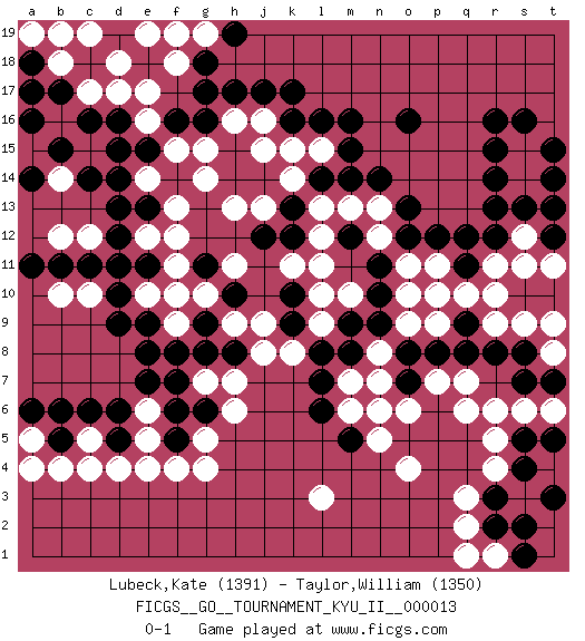 Last move : 0-1 2010 June 2 1:40:33 [Event "FICGS__GO__TOURNAMENT_KYU_II__000013"] [Site "FICGS"] [Date "2009.10.22"] [Round "1"] [Black "Lubeck,Kate"] [White "Taylor,William"] [Result "0-1"] [Rating 1 "1391"] [Rating 2 "1350"] 1.r16 d4 2.c16 r4 3.k17 l3 4.o16 q10 5.d10 e16 6.g17 c17 7.d16 d17 8.e15 f15 9.f16 e17 10.d14 b16 11.c14 g15 12.h17 e14 13.d15 f13 14.e13 e12 15.f14 g14 16.d12 e14 17.d13 f11 18.e11 f12 19.f10 g10 20.d6 f4 21.f7 f9 22.e9 e10 23.e8 d11 24.c11 g7 25.g6 h6 26.f5 g5 27.f6 g4 28.g8 h7 29.g9 j9 30.q12 b4 31.b6 o11 32.o13 o4 33.m12 m10 34.r8 r9 35.q8 q6 36.q9 r10 37.s5 s6 38.s4 r5 39.r3 q3 40.r2 q2 41.t3 l15 42.m16 j16 43.j17 n13 44.o12 n12 45.n14 m13 46.m14 l13 47.l14 k14 48.l16 s12 49.r13 s14 50.s13 t13 51.r14 s15 52.s16 r11 53.k13 l12 54.k12 k15 55.n11 l11 56.n10 o10 57.n9 o9 58.o8 n8 59.m9 l9 60.m8 n7 61.s7 t6 62.s2 p7 63.p10 p11 64.p8 s9 65.s8 t8 66.h10 h9 67.g11 f10 68.f8 f18 69.g18 j13 70.j12 h13 71.k16 h16 72.g16 h11 73.m15 j15 74.l8 k8 75.k10 l10 76.h8 j8 77.o7 o6 78.t7 t9 79.q11 p9 80.p12 p10 81.r12 s11 82.t12 t11 83.t5 r6 84.t15 b14 85.b15 a15 86.b17 b18 87.a16 d18 88.a18 c19 89.b19 a19 90.k9 k11 91.b19 c10 92.d9 a19 93.n6 m7 94.b19 c12 95.b11 a19 96.l7 m6 97.b19 b12 98.c18 b10 99.e11 b18 100.m5 n5 101.c18 d11 102.a11 b18 103.e11 a19 104.d11 a17 105.l6 n6 106.a18 b19 107.a14 e19 108.r15 c5 109.c6 e5 110.t14 e6 111.d5 r1 112.s1 q1 113.b5 c4 114.e7 e4 115.t12 q7 116.t13 a5 117.a6 a4 118.a17 g19 119.h19 f19 0-1 Here are the names of the openings (joseki) played in the four corners : Corner d16 : c16 e16 Komoku (Somok, Xiao~mu`) 3-4 Point. The komoku (3-4) point is the traditional corner enclosure move.. Ikken Takagakari (Hankan Nop'dakeolch'im, Yi Gaogua`jiao~, 1-Space High Approach). The 5-4 approach move has become more popular in modern times, as modern Go emphasizes speed and influence. Corner d4 : d4 d6 Hoshi (Hwajeom, Seongjeom, Xingwei`) 4-4 Point. The star or hoshi (4-4) point, emphasizing influence at the potential expense of territory. Ikken Takagakari (Hankan Nop'dakeolch'im, Yi Gaojia, 1-Space High Approach). White typically responds at 6-4 or 3-10. White 4-10 is played when White finds play on the right side advantageous. White 4-8 or 3-8 may be played when White has support at top. Player White won this Go (weiqi, baduk) game. Follow this game move after move (download)At the head of two stones in a row, play hane. (Anonymous) The quality of decision is like the well-timed swoop of a falcon which enables it to strike and destroy its victim. (Sun Tzu)