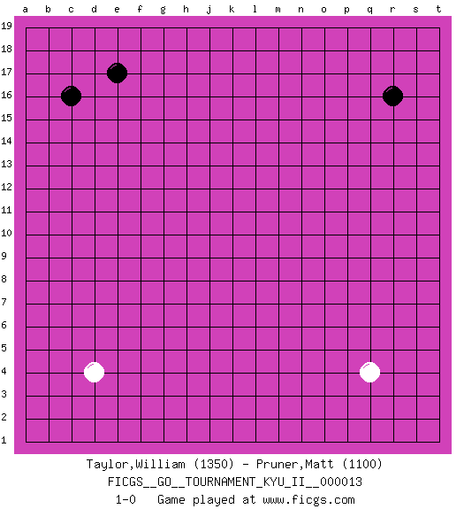 Last move : 1-0 2009 December 5 21:10:29 [Event "FICGS__GO__TOURNAMENT_KYU_II__000013"] [Site "FICGS"] [Date "2009.10.22"] [Round "1"] [Black "Taylor,William"] [White "Pruner,Matt"] [Result "1-0"] [Rating 1 "1350"] [Rating 2 "1100"] 1.r16 d4 2.c16 q4 3.e17 1-0 This go game has been lost on time (started : 2009.10.22 0:16:58) Here are the names of the openings (joseki) played in the four corners : Player Black won this Go (weiqi, baduk) game. Follow this game move after move (download)The simplest move is the best move. (Anonymous) If I had no sense of humor, I would long ago have committed suicide. (Mahatma Gandhi)