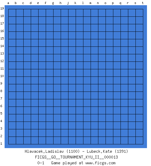 Last move : 0-1 2009 November 21 8:37:16 [Event "FICGS__GO__TOURNAMENT_KYU_II__000013"] [Site "FICGS"] [Date "2009.10.22"] [Round "1"] [Black "Hlavacek,Ladislav"] [White "Lubeck,Kate"] [Result "0-1"] [Rating 1 "1100"] [Rating 2 "1391"] 0-1 This go game has been lost on time (started : 2009.10.22 0:16:58) Here are the names of the openings (joseki) played in the four corners : Player White won this Go (weiqi, baduk) game. Follow this game move after move (download)Territory really exists only in the end. (Pierre Audouard) Optimism is a variety of information deficit. Sometimes especially true for correspondence chess games. (Michael Aigner)