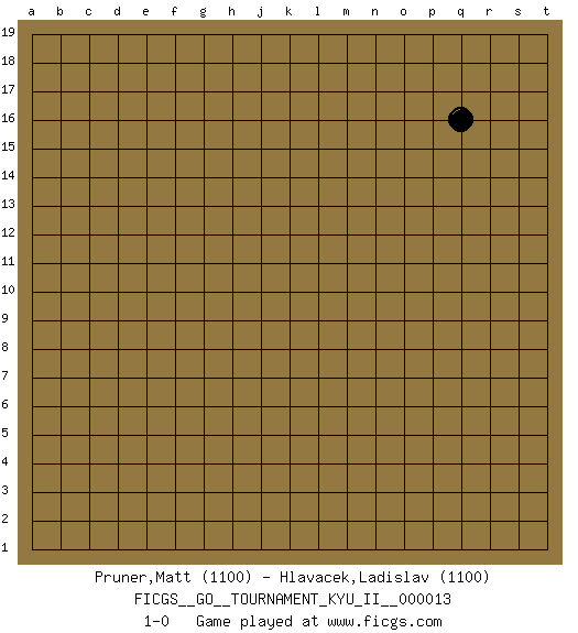 Last move : 1-0 2009 December 6 9:17:56 [Event "FICGS__GO__TOURNAMENT_KYU_II__000013"] [Site "FICGS"] [Date "2009.10.22"] [Round "1"] [Black "Pruner,Matt"] [White "Hlavacek,Ladislav"] [Result "1-0"] [Rating 1 "1100"] [Rating 2 "1100"] 1.q16 1-0 This go game has been lost on time (started : 2009.10.22 0:16:58) Here are the names of the openings (joseki) played in the four corners : Player Black won this Go (weiqi, baduk) game. Follow this game move after move (download)The carpenter's square becomes ko. (Anonymous) . 'gn is not allowed in chess unless n is an integer between 1 and 8 inclusive, where 1 and 8 are to interpreted as the standard numerals standing for integers in the ordered real-closed field R, with the *canonical* ordering. (As opposed to, say, an integer in the domain Z[2+i*sqrt(5)] or an integer in some exotic Grothendieck topos). (Normajean Yates)