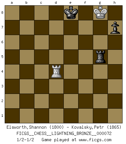 Last move : 1/2-1/2 2009 October 24 9:3:28 [Event "FICGS__CHESS__LIGHTNING_BRONZE__000072"] [Site "FICGS"] [Date "2009.10.24"] [Round "1"] [White "Elsworth,Shannon"] [Black "Kovalsky,Petr"] [Result "1/2-1/2"] [WhiteElo "1800"] [BlackElo "1865"] 1.e4 c5 2.c3 d5 3.Nf3 dxe4 4.Qa4+ Nc6 5.Qxe4 Nf6 6.Qf4 e6 7.Bb5 Bd6 8.Bxc6+ bxc6 9.Qa4 O-O 10.O-O e5 11.d3 Bf5 12.Rd1 Qd7 13.Na3 Bc7 14.Ne1 Nd5 15.Nc4 e4 16.dxe4 Bxe4 17.Be3 Qe6 18.Qa3 Nxe3 19.Nxe3 Rfb8 20.g3 f5 21.Qxc5 Rxb2 22.Qc4 Re8 23.Qxe6+ Rxe6 24.Nd3 Bxd3 25.Rxd3 Bb6 26.a4 Bxe3 27.fxe3 Re4 28.a5 a6 29.Rd8+ Kf7 30.Ra8 Rxe3 31.Rxa6 Rxc3 32.Ra7+ Kf6 33.Rc7 R3c2 34.h4 Rg2+ 35.Kf1 Rbf2+ 36.Ke1 Rc2 37.Kf1 Rh2 38.Kg1 Rcg2+ 39.Kf1 Rd2 40.Kg1 Rhg2+ 41.Kh1 c5 42.a6 Rh2+ 43.Kg1 Rdg2+ 44.Kf1 Rxg3 45.a7 Rh1+ 46.Kf2 Rxa1 47.Kxg3 c4 48.Kf4 c3 49.Rc6+ Ke7 50.Rxc3 Rxa7 51.Kxf5 Ra5+ 52.Kf4 Kd6 53.Re3 Rd5 54.Kg4 Rd4+ 55.Kg5 g6 56.Ra3 Rd5+ 57.Kf6 Rf5+ 58.Kg7 Rh5 59.Ra4 Ke7 60.Rc4 Ke6 61.Rg4 Kd7 62.Rc4 Ke7 63.Rd4 Ke8 64.Kg8 g5 65.hxg5 Rxg5+ 1/2-1/2 Comment by player 2 : Petr Kovalsky : thank you play game ! Sicilian : Alapin's variation (2.c3) Kingside Castling by player Black (move 9) Kingside Castling by player White (move 10) 10 pieces endgame at move 47 : White KRPP , Black KRPPPP WHITE : King + 1 Rook 2 Pawns BLACK : King + 1 Rook 4 Pawns 9 pieces endgame at move 50 : White KRPP , Black KRPPP WHITE : King + 1 Rook 2 Pawns BLACK : King + 1 Rook 3 Pawns 8 pieces endgame at move 50 : White KRP , Black KRPPP WHITE : King + 1 Rook 1 Pawn BLACK : King + 1 Rook 3 Pawns 7 pieces endgame at move 51 : White KRP , Black KRPP WHITE : King + 1 Rook 1 Pawn BLACK : King + 1 Rook 2 Pawns 6 pieces endgame at move 65 : White KRP , Black KRP WHITE : King + 1 Rook 1 Pawn BLACK : King + 1 Rook 1 Pawn 5 pieces endgame at move 65 : White KR , Black KRP WHITE : King + 1 Rook BLACK : King + 1 Rook 1 Pawn This chess game ended in a draw. Follow this game move after move (download)Checkers is for tramps. (Paul Morphy) Wenn Capablanka heute auf der Schachbühne erscheinen würde, hätte er ein halbes Jahr gebraucht um sich die Schachtheorie anzueignen. Und dann hätte er alles und jeden besiegt. (Mikhail Moiseyevich Botvinik) No puedes jugar al Ajedrez si eres de corazón noble. (Proverbio Francés) Un footballeur joue avec ses pieds, parfois avec sa tête. Un joueur d'échecs ne joue qu'avec sa tête. Et quand il ne joue plus, il meurt. (Jacob Murray) Players are not good because they find tactics, it is about the way to find the positions in which those tactics are hidden. (Luc-Olivier Leclerc)