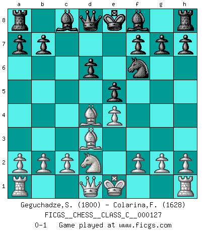 Last move : 0-1 2010 January 30 20:40:8 [Event "FICGS__CHESS__CLASS_C__000127"] [Site "FICGS"] [Date "2009.10.24"] [Round "1"] [White "Geguchadze,Sandro"] [Black "Colarina,Floram"] [Result "0-1"] [WhiteElo "1800"] [BlackElo "1628"] 1.e4 c5 2.Nf3 Nc6 3.d4 cxd4 4.Nxd4 e6 5.Be3 Nf6 6.Nd2 d6 7.Bd3 Nxd4 8.Bxd4 e5 0-1 This chess game has been lost on time (started : 2009.10.24 18:40:52) Sicilian defense Player Black won this chess game. Follow this game move after move (download)Dazzling combinations are for the many, shifting wood is for the few. (Georg Kieninger) Ich tröste mich mit dem Vergnügen, daß Schachfans, Zuschauer und Leser glücklich sind, wenn ein Großmeister etwas riskiert, statt nur Klötzchen zu schieben. (Mikhail Nekhemyevich Tal) Un jugador que trata de regresar una movida en el Ajedrez es un futuro carterista. (Richard Fenton) C'est une question de caractère, Beaucoup de gens perdent leur motivation très vite. D'autres, ils sont rares, peuvent la conserver très longtemps. J'aime les échecs, encore aujourd'hui je suis heureux d'analyser des parties. J'aime toujours gagner, je déteste encore perdre. Bien jouer est important pour mon intégrité intellectuelle et morale. Et puis les échecs vivent en ce moment une période historique grâce à Internet. Ils se développent dans les systèmes éducatifs à travers le monde. Ils sortent de leur ghetto, et c'est mon rôle de mener à bien cette révolution. (Gary Kasparov) Life is pleasant. Death is peaceful. It's the transition that's troublesome. (Isaac Asimov)