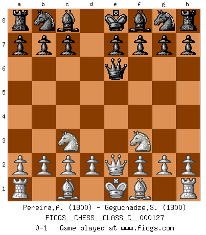 Last move : 0-1 2010 February 9 20:26:8 [Event "FICGS__CHESS__CLASS_C__000127"] [Site "FICGS"] [Date "2009.10.24"] [Round "1"] [White "Pereira,Antonio"] [Black "Geguchadze,Sandro"] [Result "0-1"] [WhiteElo "1800"] [BlackElo "1800"] 1.e4 d5 2.exd5 Qxd5 3.Nc3 Qe6+ 4.Qe2 Qg6 5.Nf3 Qe6 0-1 This chess game has been lost on time (started : 2009.10.24 18:40:52) Scandinavian (centre counter) defense Player Black won this chess game. Follow this game move after move (download)My style is somewhere between that of Tal and Petrosian. (Reshevsky) Es ist besser die Steine des Gegners zu opfern. (Savielly Grigorievitsch Tartakower) El Ajedrez es un cuento de Hadas de las 1001 metidas de pata. (Savielly Tartakower) Fischer est le meilleur joueur du monde et Karpov n'est qu'un joueur de bistrot. (Garry Kasparov, agé de 16 ans) Perseverance does not equal worthiness. Next time you want to get my attention, wear something fun. Low-riding jeans are hot. (Gregory House, House M.D.)