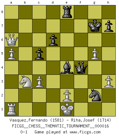 Last move : 0-1 2006 December 16 20:58:35 [Event "FICGS__CHESS__THEMATIC_TOURNAMENT__000016"] [Site "FICGS"] [Date "2006.09.30"] [Round "1"] [White "Vasquez,Fernando"] [Black "Riha,Josef"] [Result "0-1"] [WhiteElo "1581"] [BlackElo "1714"] 1.d4 g6 2.c4 Bg7 3.Nc3 c5 4.d5 Bxc3+ 5.bxc3 f5 6.Nf3 Qa5 7.Qc2 d6 8.g3 Nd7 9.Bg2 Nb6 10.Nd2 Nf6 11.O-O O-O 12.a3 Ng4 13.h3 Ne5 14.a4 Bd7 15.Nb3 Qa6 16.Bh6 Rf7 17.a5 Nbxc4 18.Rfb1 e6 19.Bc1 Re7 20.Bg5 R7e8 21.Nc1 Kg7 22.f4 Ne3 23.Qb2 Nf7 24.dxe6 Bxe6 25.Bxb7 Qc4 26.Qd2 Bd5 27.Bxa8 Bxa8 28.Qd3 Qe6 29.Bh4 g5 30.Bxg5 Nxg5 31.fxg5 Qe5 32.Kf2 f4 33.Ke1 Be4 34.Rb7+ Bxb7 35.gxf4 Qxf4 36.Nb3 Be4 37.Qb5 a6 38.Qxa6 Ng2+ 0-1 Beefeater defense Kingside Castling by player White (move 11) Kingside Castling by player Black (move 11) Player Black won this chess game. Follow this game move after move (download)I had a toothache during the first game. In the second game I had a headache. In the third game it was an attack of rheumatism. In the fourth game, I wasn't feeling well. And in the fifth game? Well, must one have to win every game ? (Siegbert Tarrasch) Über Karpov: Er war und ist ein Vertreter der russischen Reaktionäre. Das steckt tief in seiner Seele, wehalb ich nicht nett mit ihm umgehen kann. (Viktor Kortschnoi) Por tratar de evitar la pérdida de una pieza, muchas personas han perdido una partida de Ajedrez. (Savielly Tartakover) Horreur, mais aussi harmonie suprême : qu'y avait-il en effet au monde en dehors des échecs ? Le brouillard, l'inconnu, le non-être... (Vladimir Nabokov) The human is the only animal species whose members are able to talk themselves into difficulties that would not otherwise exist. (Wendell Johnson)