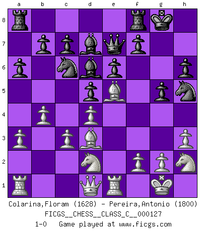 Last move : 1-0 2010 February 1 8:43:22 [Event "FICGS__CHESS__CLASS_C__000127"] [Site "FICGS"] [Date "2009.10.24"] [Round "1"] [White "Colarina,Floram"] [Black "Pereira,Antonio"] [Result "1-0"] [WhiteElo "1628"] [BlackElo "1800"] 1.e4 Nc6 2.Nf3 Nf6 3.d4 Nxe4 4.Bd3 Nf6 5.O-O d5 6.h3 Be6 7.Re1 Bd7 8.c3 e6 9.Bg5 h6 10.Bh4 g5 11.Bg3 Bd6 12.Be5 a6 13.Nbd2 Qe7 14.b4 O-O 15.a3 Nh5 16.Nh2 1-0 This chess game has been lost on time (started : 2009.10.24 18:40:52) KP : Nimzovich defense Kingside Castling by player White (move 5) Kingside Castling by player Black (move 14) Player White won this chess game. Follow this game move after move (download)I played Chess with him and would have beaten him sometimes only he always took back his last move, and ran the game out differently. (Mark Twain) Gewöhnliche Menschen denken nur daran, wie sie ihre Zeit verbringen. Ein intelligenter Mensch versucht, sie auszunutzen. (Arthur Schopenhauer) ¿Se han dado cuenta de que Fischer casi nunca ha tenido piezas malas? El las intercambia y las piezas malas se quedan con sus oponenets. (Yuri Balashov) Votre seul travail dans les ouvertures est d'obtenir un milieu de partie jouable. (Lajos Portish) Experience is the name we all give to our mistakes. (Oscar Wilde)