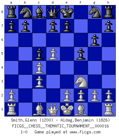 Last move : 1-0 2006 November 26 21:38:27 [Event "FICGS__CHESS__THEMATIC_TOURNAMENT__000016"] [Site "FICGS"] [Date "2006.09.30"] [Round "1"] [White "Smith,Glenn"] [Black "Aldag,Benjamin"] [Result "1-0"] [WhiteElo "1200"] [BlackElo "1826"] 1.d4 g6 2.c4 Bg7 3.Nc3 c5 4.d5 Bxc3+ 5.bxc3 f5 6.Nf3 1-0 This chess game has been lost on time (started : 2006.09.30 18:9:9) Beefeater defense Player White won this chess game. Follow this game move after move (download)Chess is a beautiful mistress. (Bent Larsen) Glücklicherweise sind Großmeister Ruben Fines reine Schachbücher weniger phallozentrisch [als seine Schachpsychologie] und deswegen auch weniger lächerlich. (Nigel Short) Yo nunca en mi vida he jugado la Defensa Francesa, que viene siendo la más aburrida de todas las Aperturas. (Wilhelm Steinitz) Mon pion favori sur ma case favorite ! Bronstein en parlant d'un coup de pion en h5 quand il avait les Noirs. Nowadays, anyone who cannot speak English and is incapable of using the Internet is regarded as backward. (Al-Waleed bin Talal)