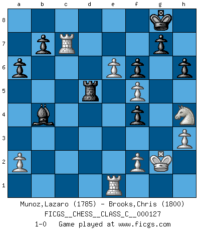 Last move : 1-0 2010 March 27 9:33:44 [Event "FICGS__CHESS__CLASS_C__000127"] [Site "FICGS"] [Date "2009.10.24"] [Round "1"] [White "Munoz,Lazaro"] [Black "Brooks,Chris"] [Result "1-0"] [WhiteElo "1785"] [BlackElo "1800"] 1.e4 c5 2.c3 d6 3.d4 Nf6 4.Bd3 e5 5.Nf3 Qc7 6.O-O c4 7.Qa4+ Bd7 8.Qxc4 Qxc4 9.Bxc4 Nc6 10.Nbd2 exd4 11.cxd4 Be7 12.d5 Ne5 13.Nxe5 dxe5 14.Bd3 Rc8 15.Nf3 Bd6 16.Be3 a6 17.Rac1 O-O 18.h3 Nh5 19.g4 Nf4 20.Bxf4 exf4 21.e5 Bc5 22.Kg2 Rfd8 23.Rfe1 h6 24.Bf5 Bxf5 25.gxf5 f6 26.e6 Rc7 27.Nh4 Rxd5 28.b4 Bxb4 29.Rxc7 1-0 Sicilian : Alapin's variation (2.c3) Kingside Castling by player White (move 6) Kingside Castling by player Black (move 17) Player White won this chess game. Follow this game move after move (download)Later, I began to succeed in decisive games. Perhaps because I realized a very simple truth: not only was I worried, but also my opponent. (Mikhail Tal) Die Arbeit ist etwas Unnatürliches. Die Faulheit allein ist göttlich. (Anatole France) Los Peones son nacidos libres, y aún así, se encuentran por doquier encadenados. (Rick Kennedy) Si rien de grave n'est détecté lors de l'analyse d'une position, on joue alors le coup. Seconde règle de Blumenfeld. Unless I accept my faults I will most certainly doubt my virtues. (Hugh Prather)
