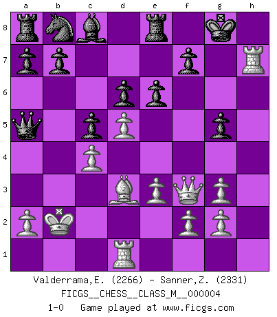 Last move : 1-0 2006 June 5 21:24:20 [Event "FICGS__CHESS__CLASS_M__000004"] [Site "FICGS"] [Date "2006.04.23"] [Round "1"] [White "Valderrama,Elmer"] [Black "Sanner,Zdzislaw"] [Result "1-0"] [WhiteElo "2266"] [BlackElo "2331"] 1.d4 Nf6 2.c4 g6 3.Nc3 Bg7 4.Nf3 d6 5.Bg5 O-O 6.e3 c5 7.d5 h6 8.Bh4 g5 9.Bg3 Nh5 10.Bd3 Nxg3 11.hxg3 e6 12.Qe2 Qa5 13.O-O-O Re8 14.Nxg5 hxg5 15.Rh7 Bxc3 16.Qf3 Bxb2 17.Kxb2 1-0 Comment by player 1 : Elmer Valderrama : Interesting is 5...h6, delaying 0-0 for a while. 10...Nxg3?! (Better is 10...f5) 11...e6!? (or 11...f5 12. Qe2 and White is better) 12. Qe2! (found by me (FBM), engines suggest crazy(pointless) "superior" lines here for White) 12...Qa5 (12...f5 13. 0-0-0 or 12...exd5 13. Nxd5 and White is better) 13. 0-0-0! (FBM, engines lose the thread here) After this move, most engines can find a forced win for White in all variations in a couple of moves, especially after an eventual Nxg5) 13...Re8 (all other alternatives lead to the same slaughter) 14. Ng5! (FBM, engines give here -+ to Black when in fact is the other way around, ie +- or better 1-0 to be exact) 15. Rh7! (given time some engines can find this move; from now on most engines start evaluating the position as lost for Black) 16. Qf3 (simple and powerful, now all engines think Black is lost) King's Indian : Smyslov system Kingside Castling by player Black (move 5) Queenside Castling by player White (move 13) Player White won this chess game. Follow this game move after move (download)I thought the most common mistake [in chess] was the first one: Learning the game :P (Garvin Gray, FICGS forum) Nach Morphy wurde nichts neues mehr in der Behandlung offener Positionen gefunden. (Mikhail Moiseyevich Botvinik) Debes de llevar a tu oponente hacia un profundo y obscuro bosque donde 2+2=5, y el camino que conduce a la salida es suficientemente ancho para solamente uno. (Mikhail Tal) A chaque perte on perd un peu de soi. (Joël Lautier) Hello Thibault, if I have had a plan (and I had one, I hope), I have forgotten it during the last week... - Hello Heinz-Georg. What do you mean a plan ? (Anonymous players, during a Big Chess game)