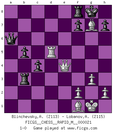 Last move : 1-0 2010 February 1 17:49:25 [Event "FICGS__CHESS__RAPID_M__000021"] [Site "FICGS"] [Date "2009.10.24"] [Round "1"] [White "Blinchevsky,Alexander"] [Black "Lobanov,Alex"] [Result "1-0"] [WhiteElo "2113"] [BlackElo "2115"] 1.d4 Nf6 2.c4 e6 3.Nf3 b6 4.g3 Ba6 5.b3 Bb4+ 6.Bd2 Be7 7.Bg2 c6 8.Bc3 d5 9.Nbd2 Nbd7 10.O-O c5 11.Re1 O-O 12.cxd5 Nxd5 13.Bb2 Bb7 14.a3 a5 15.Rc1 N5f6 16.e4 a4 17.bxa4 Bc6 18.Qe2 Rxa4 19.d5 exd5 20.exd5 Nxd5 21.Nc4 Ba8 22.Rcd1 Bf6 23.Nfe5 Nxe5 24.Nxe5 c4 25.Qc2 b5 26.Rxd5 Bxd5 27.Rd1 Bxe5 28.Bxe5 Rxa3 29.Rxd5 Qa5 30.Bf1 Qa6 31.Qe4 Rb3 32.Bxg7 1-0 Queen's Indian : Nimzovich variation (exaggerated Fianchetto) Kingside Castling by player White (move 10) Kingside Castling by player Black (move 11) Player White won this chess game. Follow this game move after move (download)Nonsense was the last thing Fischer was interested in, as far as Chess was concerned. (Elie Agur) Dein Körper muss in Topform sein. Dein Schach verfällt, wenn dein Körper verfällt. Der Körper kann nicht vom Geist getrennt werden. (Robert James Fischer) Tu no necesitas jugar muy bien, únicamente ayudar a tu oponenet a que juegue muy mal. (Genrikh Chepukaitis) C'est la seule position que je connaisse où les deux camps sont mals. Propos prêtés à V. Anand. Pushing plastic is for the many, pushing virtual pieces is for the fewer, pushing wood is for the very few. (Normajean Yates)