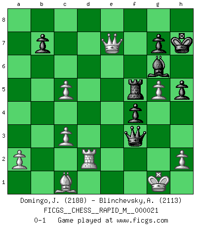 Last move : 0-1 2010 February 5 9:43:14 [Event "FICGS__CHESS__RAPID_M__000021"] [Site "FICGS"] [Date "2009.10.24"] [Round "1"] [White "Domingo,Jordi"] [Black "Blinchevsky,Alexander"] [Result "0-1"] [WhiteElo "2188"] [BlackElo "2113"] 1.e4 c6 2.d4 d5 3.e5 Bf5 4.Nc3 e6 5.g4 Bg6 6.Nge2 Ne7 7.f4 h5 8.f5 exf5 9.g5 c5 10.dxc5 Nec6 11.Qxd5 Na6 12.Nf4 Nab4 13.Qg2 Nd4 14.Bb5+ Nxb5 15.Nxb5 Bxc5 16.c3 Nc6 17.b4 a6 18.bxc5 axb5 19.e6 Ra4 20.O-O O-O 21.Rb1 fxe6 22.Rxb5 Qc8 23.Qc2 Rxf4 24.Rxf4 e5 25.Rf1 Kh7 26.Qg2 Rf7 27.Rb2 f4 28.Rbf2 Qe6 29.Ba3 Ne7 30.Bc1 Nf5 31.Rd2 Nh4 32.Qd5 Qh3 33.Qxe5 Rf5 34.Qe7 Nf3+ 35.Rxf3 Qxf3 0-1 Caro-Kann : Advance variation Kingside Castling by player White (move 20) Kingside Castling by player Black (move 20) Player Black won this chess game. Follow this game move after move (download)One bad move nullifies forty good ones. (Horowitz) Wenn du nicht weißt was du tun sollst, warte bis dein Gegner eine Idee hat. Sie wird sicher schlecht sein. (Siegbert Tarrasch) El Ajedrez es parte de una cultura y si una cultura esta en decadencia, entonces también el Ajedrez declinará. (Mikhail Botvinnik) Les échecs, c'est la lutte contre l'erreur. (Johannes Zukertort) Life is painting a picture, not doing a sum. (Oliver Wendell Holmes, Jr.)