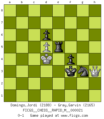 Last move : 0-1 2010 June 7 9:18:48 [Event "FICGS__CHESS__RAPID_M__000021"] [Site "FICGS"] [Date "2009.10.24"] [Round "1"] [White "Domingo,Jordi"] [Black "Gray,Garvin"] [Result "0-1"] [WhiteElo "2188"] [BlackElo "2165"] 1.e4 d6 2.d4 Nf6 3.Nc3 g6 4.f4 Bg7 5.Nf3 O-O 6.Bd3 Na6 7.O-O c5 8.d5 Bg4 9.Bc4 Nd7 10.h3 Bxf3 11.Qxf3 Qa5 12.Nb5 Nb6 13.Na3 Nxc4 14.Nxc4 Qb4 15.Ne3 c4 16.c3 Qb5 17.f5 Nc5 18.Ng4 Nd3 19.f6 exf6 20.Bh6 Bxh6 21.Nxh6+ Kg7 22.Qxf6+ Kxh6 23.g4 Rae8 24.Rf5 Re5 25.Raf1 Qb6+ 26.Kg2 Qxb2+ 27.Kg3 Qxc3 28.Rh5+ Rxh5 29.Qxc3 Re5 30.Qxc4 Nc5 31.Kg2 f6 32.Qb4 Rf7 33.Qa5 b6 34.Qb5 Kg7 35.Qc6 Nxe4 36.Re1 Rfe7 37.Re2 h6 38.Re3 f5 39.Rf3 Kh7 40.Rf1 Rf7 41.gxf5 gxf5 42.Re1 R5e7 43.Kf1 Rc7 44.Qe8 Rg7 45.Qf8 Rcf7 46.Qc8 Rg3 47.Rc1 Rf3+ 48.Ke2 Rxh3 49.Rc7 Rh2+ 50.Kd3 Rxc7 51.Qxc7+ Kg6 52.Qxa7 h5 53.Qxb6 Rxa2 54.Qd8 Ra3+ 55.Kd4 Ra1 56.Qg8+ Kh6 57.Qd8 Re1 58.Kd3 Kg7 59.Qc8 f4 60.Qd7+ Kg6 61.Qe6+ Kg5 62.Qg8+ Kh4 63.Qf7 Kg3 64.Qg6+ Kf2 65.Qxh5 Re3+ 66.Kd4 Ng3 67.Qh2+ Kf3 68.Qh3 Re5 0-1 This chess game has been lost on time (started : 2009.10.24 23:42:0) Pirc : Austrian attack, 6.Bd3 Kingside Castling by player Black (move 5) Kingside Castling by player White (move 7) 10 pieces endgame at move 53 : White KQPP , Black KRNPPP WHITE : King + 1 Queen 2 Pawns BLACK : King + 1 Rook 1 Knight 3 Pawns 9 pieces endgame at move 53 : White KQP , Black KRNPPP WHITE : King + 1 Queen 1 Pawn BLACK : King + 1 Rook 1 Knight 3 Pawns 8 pieces endgame at move 65 : White KQP , Black KRNPP WHITE : King + 1 Queen 1 Pawn BLACK : King + 1 Rook 1 Knight 2 Pawns Player Black won this chess game. Follow this game move after move (download)When you don't know what to do, wait for your opponent to get an idea - it's sure to be wrong. (Tarrasch) Um dein Spiel zu verbessern musst du zuallererst das Endspiel studieren, denn diese kann unabhängig studiert werden. Die Eröffnung und das Mittelspiel müssen immer in Bezug gesetzt werden zum Endspiel. (José Raúl Capablanca) Fischer es una tragedia del Ajedrez Americano a la par con Morphy y Pillsbury. (Mig Greengard) Un millionnaire : 'Monsieur Steinitz ! Vous ne participez aux tournois que pour l'argent, alors que moi je n'y viens que pour l'honneur.' Steinitz : 'Chacun joue pour ce qu'il n'a pas'... There's always a bigger fish. (Qui-Gon Jinn in Star Wars ep.1)