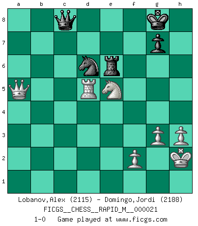 Last move : 1-0 2010 May 2 7:46:30 [Event "FICGS__CHESS__RAPID_M__000021"] [Site "FICGS"] [Date "2009.10.24"] [Round "1"] [White "Lobanov,Alex"] [Black "Domingo,Jordi"] [Result "1-0"] [WhiteElo "2115"] [BlackElo "2188"] 1.d4 d5 2.c4 dxc4 3.Nc3 e5 4.e3 exd4 5.exd4 Nf6 6.Bxc4 Be7 7.Nf3 O-O 8.O-O Nbd7 9.Re1 Nb6 10.Bb3 c6 11.Bg5 Bf5 12.Ne5 Nfd5 13.Bxe7 Nxe7 14.Nxf7 Rxf7 15.Bxf7+ Kxf7 16.Qf3 Kg8 17.Rxe7 Qxe7 18.Qxf5 Re8 19.Qd3 Qe6 20.g3 Nd5 21.a3 Nb6 22.Qc2 Rd8 23.Rd1 h6 24.Rd2 Qf7 25.Qd1 Nc4 26.Re2 b5 27.Qd3 a6 28.h3 Qf6 29.Qe4 Rf8 30.Kg2 Kh8 31.Rc2 a5 32.d5 Nd6 33.Qd3 b4 34.Nd1 bxa3 35.bxa3 cxd5 36.Qxd5 Nf5 37.Rd2 Qg6 38.Kh2 Qb6 39.Qe5 Rf6 40.Qe8+ Kh7 41.Qe4 Kh8 42.Rd5 Nd6 43.Qd3 Kg8 44.a4 Qb4 45.Kg2 Qb7 46.Ne3 Qb6 47.Ng4 Re6 48.Kh2 Qb4 49.Qa6 h5 50.Rxh5 Qxa4 51.Rd5 Qc4 52.Qxa5 Qc8 53.Ne5 1-0 This chess game has been lost on time (started : 2009.10.24 23:42:0) Queen's gambit accepted Kingside Castling by player Black (move 7) Kingside Castling by player White (move 8) Player White won this chess game. Follow this game move after move (download)Fischer sacrificed virtually everything most of us weakies (to use his term) value, respect, and cherish, for the sake of an artful, often beautiful board game, for the ambivalent privilege of being its greatest master. (Paul Kollar) Wie gewinnt Tal? Er entwickelt alle seine Figuren in die Brettmitte und opfert sie dann irgendwo. (Robert James Fischer) En el Ajedrez, tal como es jugado por los Maestros, practicamente la suerte es eliminada. (Emanuel Lasker) Je menace de comprendre la position. (Anonyme) Better than a thousand days of diligent study is one day with a great teacher. (Japanese proverb)