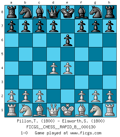 Last move : 1-0 2009 November 30 9:1:35 [Event "FICGS__CHESS__RAPID_B__000130"] [Site "FICGS"] [Date "2009.10.29"] [Round "1"] [White "Pillon,Thibault"] [Black "Elsworth,Shannon"] [Result "1-0"] [WhiteElo "1800"] [BlackElo "1800"] 1.e4 e6 2.d4 1-0 This chess game has been lost on time (started : 2009.10.29 17:25:19) French defense Player White won this chess game. Follow this game move after move (download)Combinations have always been the most intriguing aspect of Chess. The masters look for them, the public applauds them, the critics praise them. It is because combinations are possible that Chess is more than a lifeless mathematical exercise. They are the poetry of the game; they are to Chess what melody is to music. They represent the triumph of mind over matter. (Reuben Fine) Alles was am Schachbrett zählt sind gute Züge. (Robert James Fischer) La única cosa que los jugadores de Ajedrez tienen en común, es el Ajedrez. (Lodewijk Prins) Les Echecs mettent en conflit, non pas deux intelligences, mais deux volontés. (Lasker) The problem with troubleshooting is that trouble shoots back. (Anonymous)