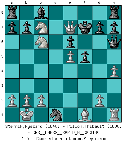 Last move : 1-0 2009 November 5 22:25:37 [Event "FICGS__CHESS__RAPID_B__000130"] [Site "FICGS"] [Date "2009.10.29"] [Round "1"] [White "Sternik,Ryszard"] [Black "Pillon,Thibault"] [Result "1-0"] [WhiteElo "1840"] [BlackElo "1800"] 1.e4 c5 2.Nc3 Nc6 3.Nf3 d6 4.d4 cxd4 5.Nxd4 Nf6 6.Bg5 e6 7.Qd3 Be7 8.O-O-O Ng4 9.Bxe7 Qxe7 10.Nxc6 Qg5+ 11.Kb1 Nxf2 12.Qxd6 Nxd1 13.Nb5 f5 14.h4 Qf6 15.Nc7+ Kf7 16.e5 Qh6 17.Qe7+ 1-0 Sicilian : Closed, 2...Nc6 Queenside Castling by player White (move 8) Player White won this chess game. Follow this game move after move (download)Examine moves that smite! A good eye for smites is far more important than a knowledge of strategical principles. (Purdy) Ich organisiere ein großes Turnier, was mich etwa 120000 Dollar kostet. Ich denke, das ist das erste Mal in der Schachgeschichte, daß ein Schachgroßmeister auch als Mäzen auftritt. (Miguel Najdorf) Yo no creo en la psicología. Yo creo en las buenas movidas. (Bobby Fischer) Les échecs, c'est l'art d'analyser. (Mikhail Botvinnik) Memory is a way of holding onto the things you love, the things you are, the things you never want to lose. (from the television show: The Wonder Years)