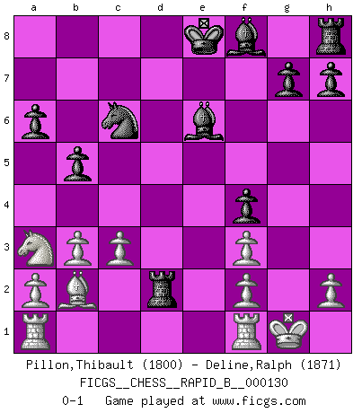Last move : 0-1 2009 November 9 12:8:53 [Event "FICGS__CHESS__RAPID_B__000130"] [Site "FICGS"] [Date "2009.10.29"] [Round "1"] [White "Pillon,Thibault"] [Black "Deline,Ralph"] [Result "0-1"] [WhiteElo "1800"] [BlackElo "1871"] 1.e4 c5 2.Nc3 Nc6 3.Nf3 Nf6 4.d4 cxd4 5.Nxd4 e5 6.Ndb5 d6 7.Bc4 a6 8.Na3 b5 9.Bd5 Bd7 10.Ne2 Nxd5 11.Qxd5 Rc8 12.c3 Be6 13.Qd3 d5 14.b3 dxe4 15.Qxe4 f5 16.Qe3 Qd5 17.O-O f4 18.Qf3 Qxf3 19.gxf3 Rd8 20.Bb2 Rd2 21.Nxf4 exf4 0-1 Sicilian : Closed, 2...Nc6 Kingside Castling by player White (move 17) Player Black won this chess game. Follow this game move after move (download)By this measure (on the gap between Fischer & his contemporaries), I consider him the greatest world champion. (Garry Kasparov) Wir können eben der zündenden Macht des Opfers nicht wiederstehen, denn die Begeisterung für das Opfer liegt in der Natur des Menschen. (Rudolf Spielmann) Yo considero que Fischer es uno de los expertos mas grandes de aperturas de siempre. (Keith Hayward) À la honte des hommes, on sait que les lois du jeu sont les seules qui soient partout justes, claires, inviolables et exécutées. Pourquoi l'Indien qui a donné les règles du jeu d'échecs est-il obéi de bon gré dans toute la terre, et que les décrétales des papes, par exemple, sont aujourd'hui un objet d'horreur et de mépris ? C'est que l'inventeur des échecs combina tout avec justesse pour la satisfaction des joueurs, et que les papes, dans leurs décrétales, n'eurent en vue que leur seul avantage. L'Indien voulut exercer également l'esprit des hommes et leur donner du plaisir; les papes ont voulu abrutir l'esprit des hommes. Voltaire (Dictionnaire philosophique / Garnier 1967) If we don't succeed, we run the risk of failure. (George W. Bush)