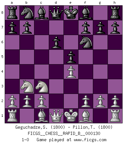 Last move : 1-0 2009 November 24 19:44:44 [Event "FICGS__CHESS__RAPID_B__000130"] [Site "FICGS"] [Date "2009.10.29"] [Round "1"] [White "Geguchadze,Sandro"] [Black "Pillon,Thibault"] [Result "1-0"] [WhiteElo "1800"] [BlackElo "1800"] 1.e4 c5 2.Nf3 d6 3.d4 cxd4 4.Nxd4 Nf6 5.Nc3 e5 6.Nb3 1-0 Sicilian Player White won this chess game. Follow this game move after move (download)You need not play well - just help your opponent to play badly. (Genrikh Chepukaitis) Ich verstehe den Grund nicht, warum die Aufteilung in Frauen und Männer überhaupt im Schach besteht. (Judith Polgar) No es tiempo de jugar al Ajedrez cuando la casa esta en llamas. (Proverbio Italiano) Les sacrifices démontrent seulement que quelqu'un a gaffé. (Savielly Tartacover) Bobby never cared about money, though. His only desire was to prove that his choices were correct: He wanted chess to be important because he was a chess player, and he wanted to be important. Bobby knew money was important, but he didn't have a clue why, outside of clothes and status. The only way he could accomplish what he wanted was to fight for a lot of money. Once he got it, he gave it away. He did not know how to spend it. And once he'd become champion, after, essentially, sacrificing his life for it, he didn't know how to spend his time. (Bob Wade)