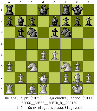 Last move : 1-0 2010 January 27 20:31:50 [Event "FICGS__CHESS__RAPID_B__000130"] [Site "FICGS"] [Date "2009.10.29"] [Round "1"] [White "Deline,Ralph"] [Black "Geguchadze,Sandro"] [Result "1-0"] [WhiteElo "1871"] [BlackElo "1800"] 1.c4 b6 2.Nc3 e6 3.Nf3 Bb7 4.g3 Nf6 5.Bg2 Be7 6.O-O O-O 7.d4 d5 8.cxd5 Nxd5 9.Qc2 Nd7 10.e4 Nb4 11.Qd2 Nf6 12.a3 Nc6 13.Rd1 1-0 This chess game has been lost on time (started : 2009.10.29 17:25:19) English Opening Kingside Castling by player White (move 6) Kingside Castling by player Black (move 6) Player White won this chess game. Follow this game move after move (download)Chess holds its master in its own bonds, shackling the mind and brain so that the inner freedom of the very strongest must suffer. (Albert Einstein) Rubinstein ist ein Turmendspiel, welches die Götter vor tausenden von Jahren begannen. (Savielly Grigorievitsch Tartakower) Cuando veas una buena jugada, trata de encontrar otra mejor. (Emanuel Lasker) Le joueur d'Echecs qui veut atteindre le top est obligé de développer son propre credo créatif. Alexeï Stepanovicth Souétine. Il est facile d'écrire des livres ! Ce qui est difficile, c'est de jouer ! (Alexeï Stepanovicth Souétine) All men can see these tactics whereby I conquer, but what none can see is the strategy out of which victory is evolved. (Sun Tzu)