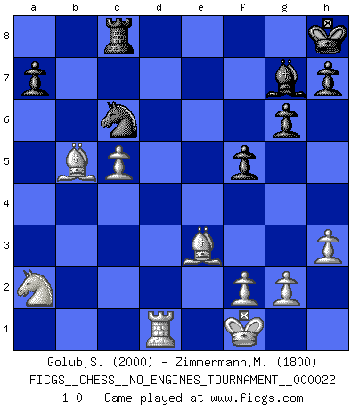 Last move : 1-0 2010 April 22 16:59:46 [Event "FICGS__CHESS__NO_ENGINES_TOURNAMENT__000022"] [Site "FICGS"] [Date "2009.10.30"] [Round "1"] [White "Golub,Sergey"] [Black "Zimmermann,Melchior"] [Result "1-0"] [WhiteElo "2000"] [BlackElo "1800"] 1.d4 d6 2.c4 Nf6 3.Nc3 g6 4.e4 Bg7 5.Nf3 O-O 6.Be2 Nc6 7.O-O Bd7 8.d5 Nb8 9.Bg5 c6 10.Qd2 cxd5 11.exd5 Re8 12.Rfe1 e5 13.dxe6 Bxe6 14.Rad1 Nc6 15.Qxd6 Qxd6 16.Rxd6 Ng4 17.h3 Nge5 18.Nxe5 Nxe5 19.c5 Bxa2 20.Nxa2 Nc4 21.Rd7 b6 22.b4 bxc5 23.bxc5 Ne5 24.Re7 f6 25.Rxe8+ Rxe8 26.Be3 f5 27.Kf1 Nc6 28.Bc4+ Kh8 29.Bb5 Rc8 30.Rd1 1-0 Old Indian defense Kingside Castling by player Black (move 5) Kingside Castling by player White (move 7) Player White won this chess game. Follow this game move after move (download)Chess, like any creative activity, can exist only through the combined efforts of those who have creative talent, and those who have the ability to organize their creative work. (Mikhail Botvinnik) Wir irren allesamt, nur jeder irrt anders. (Georg Christoph Lichtenberg) Hay jugadores fuertes y personas amables y yo soy un jugador fuerte. (Bobby Fischer) Pour se monter efficace, un Cavalier a besoin d'avant-postes ! Les Cavaliers font les meilleurs bloqueurs de pions passés. Man with more than one clock never knows what time it is. (Chinese thought)