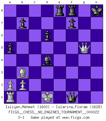 Last move : 0-1 2009 December 11 16:19:50 [Event "FICGS__CHESS__NO_ENGINES_TOURNAMENT__000022"] [Site "FICGS"] [Date "2009.10.30"] [Round "1"] [White "Isliyen,Mehmet"] [Black "Colarina,Floram"] [Result "0-1"] [WhiteElo "1600"] [BlackElo "1628"] 1.e4 c5 2.Nf3 d6 3.c3 Nc6 4.d4 cxd4 5.Bb5 dxc3 6.Nxc3 a6 7.Ba4 Bd7 8.O-O g6 9.Bf4 Bg7 10.Bb3 Nf6 11.Ng5 O-O 12.h4 h6 13.Qd3 hxg5 14.Bxg5 Ne5 15.Qd2 Nh7 16.f4 Nxg5 17.hxg5 Nc6 18.f5 Nd4 19.Bd5 Nc6 20.Qf4 Bd4+ 21.Kh1 e6 22.Bb3 exf5 23.Nd5 Be5 24.Qh4 Nd4 25.Bd1 Ne6 26.exf5 Qxg5 27.Qb4 Nf4 28.Nxf4 Bxf5 29.Bb3 a5 30.Qd2 Qh4+ 31.Kg1 g5 32.Nh3 Bxh3 33.gxh3 Qxh3 34.Qxg5+ Kh8 35.Kf2 Bd4+ 36.Ke2 Rae8+ 37.Kd1 Qxf1+ 0-1 Sicilian Kingside Castling by player White (move 8) Kingside Castling by player Black (move 11) Player Black won this chess game. Follow this game move after move (download)Place the contents of the Chess box in a hat, shake them up vigorously, pour them on the board from a height of two feet, and you get the style of Steinitz. (H. E. Bird) Spiel ein langweiliges Spiel zu Ende und lustige Dinge können passieren. (Hans Ree) Una mala movida nulifica cuarenta buenas. (Horowitz) Les échecs, c'est l'imagination. (David Bronstein) All politicians must be presumed guilty until they are proven innocent. (Dinesh De Silva)