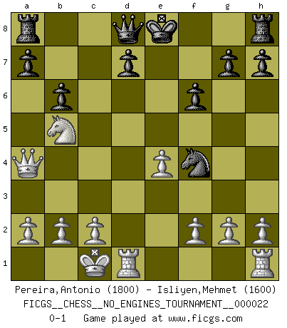 Last move : 0-1 2010 January 27 20:31:50 [Event "FICGS__CHESS__NO_ENGINES_TOURNAMENT__000022"] [Site "FICGS"] [Date "2009.10.30"] [Round "1"] [White "Pereira,Antonio"] [Black "Isliyen,Mehmet"] [Result "0-1"] [WhiteElo "1800"] [BlackElo "1600"] 1.e4 e5 2.Nf3 Nc6 3.d4 exd4 4.Nxd4 Nxd4 5.Qxd4 c5 6.Qe5+ Ne7 7.Qxc5 Ng6 8.Qd4 b6 9.Nc3 Bb7 10.Be3 f6 11.Qa4 Bd6 12.O-O-O Bc6 13.Bb5 Bxb5 14.Nxb5 Bf4 15.Bxf4 Nxf4 0-1 This chess game has been lost on time (started : 2009.10.30 1:39:45) Scotch game Queenside Castling by player White (move 12) Player Black won this chess game. Follow this game move after move (download)When your house is on fire, you can't be bothered with the neighbors. Or, as we say in Chess, if your King is under attack you don't worry about losing a Pawn on the Queen's side. (Gary Kasparov) Wenn du auf das Glück wartest, wird das Leben ziemlich langweilig. (Mikhail Nekhemyevich Tal) Para mi, el Ajedrez es la vida y cada partida es como una nueva vida. Todo jugador de Ajedrez suele vivir muchas vidas durante su vida. (Eduard Gufeld) Pour moi, les échecs ne sont pas un jeu mais un art. (Alexandre Alekhine) Warrior pose battles inner weakness and wins focus. You see that there is no war within you. You're on your own side, and you are your own strength. (Terri Guillemets)