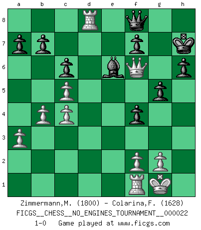 Last move : 1-0 2009 November 5 17:25:50 [Event "FICGS__CHESS__NO_ENGINES_TOURNAMENT__000022"] [Site "FICGS"] [Date "2009.10.30"] [Round "1"] [White "Zimmermann,Melchior"] [Black "Colarina,Floram"] [Result "1-0"] [WhiteElo "1800"] [BlackElo "1628"] 1.e4 e5 2.Nf3 Nc6 3.Bc4 Bc5 4.O-O Nf6 5.Nc3 O-O 6.d3 d6 7.h3 Na5 8.Bg5 Nxc4 9.dxc4 h6 10.Bh4 c6 11.a3 Be6 12.Qe2 g5 13.Bg3 Nh5 14.b4 Bb6 15.Rad1 Nf4 16.Bxf4 exf4 17.c5 Bc7 18.e5 Qc8 19.exd6 Bxh3 20.d7 Bxd7 21.Ne4 Kg7 22.c4 Re8 23.Qb2+ Be5 24.Nxe5 Be6 25.Nd7 Kh7 26.Nef6+ Kg6 27.Nxe8 Qxe8 28.Rd6 Rd8 29.Qf6+ Kh7 30.Nf8+ Qxf8 31.Rxd8 1-0 Giuoco Piano Kingside Castling by player White (move 4) Kingside Castling by player Black (move 5) Player White won this chess game. Follow this game move after move (download)When you don't know what to do, wait for your opponent to get an idea - it's sure to be wrong. (Tarrasch) Es ist peinlich, dass ich nie Weltmeister wurde. Es wäre leicht, Leonid Breschnjew als Ursache vorzuschieben, dessen Apparat den Vorzeigekommunisten Anatoli Karpow in allem unterstützte. Aber Garri Kasparow zum Beispiel, der ebenfalls von den Sowjets unerwünscht war, hat trotz der Widerstände den WM-Titel erobert. (Viktor Kortschnoi) Si el ingenio solamente fuese necesario para lucirse, las mujeres serían las mejores jugadoras de Ajedrez del mundo. (Albin) Karpov est une pièce de musée. (Garry Kasparov) Logic : The art of thinking and reasoning in strict accordance with the limitations and incapacities of the human misunderstanding. (Ambrose Bierce)