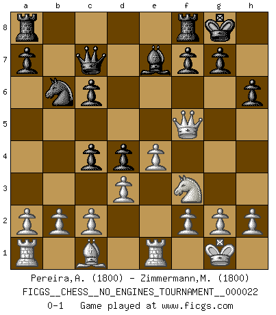 Last move : 0-1 2010 January 28 20:36:45 [Event "FICGS__CHESS__NO_ENGINES_TOURNAMENT__000022"] [Site "FICGS"] [Date "2009.10.30"] [Round "1"] [White "Pereira,Antonio"] [Black "Zimmermann,Melchior"] [Result "0-1"] [WhiteElo "1800"] [BlackElo "1800"] 1.e4 c5 2.Bc4 e6 3.Qf3 Nc6 4.Ne2 Nf6 5.O-O Be7 6.Bb5 O-O 7.Bxc6 bxc6 8.d3 e5 9.Ng3 d5 10.Nf5 d4 11.Nd2 Bxf5 12.Qxf5 Nd7 13.Nc4 Nb6 14.Nxe5 Qc7 15.Nf3 h6 16.Re1 c4 0-1 This chess game has been lost on time (started : 2009.10.30 1:39:45) Sicilian defense Kingside Castling by player White (move 5) Kingside Castling by player Black (move 6) Player Black won this chess game. Follow this game move after move (download)The essence of Chess is thinking about what Chess is. (David Bronstein) Dass jemand wie Surab Asmaiparaschwili, der selbst Elopunkte gekauft hat , Vize-Präsident der Fide werden konnte, sagt schon einges über den Zustand dieser Organisation aus. (Joel Lautier) Una buena memoria, concentración, imaginación y una fuerte voluntad, se requiere para llegar a ser un buen jugador. (Bobby Fischer) Aidez vos pièces, elles vous aideront. (Paul Morphy) The beginning of wisdom is silence. The second step is listening. (Unknown)