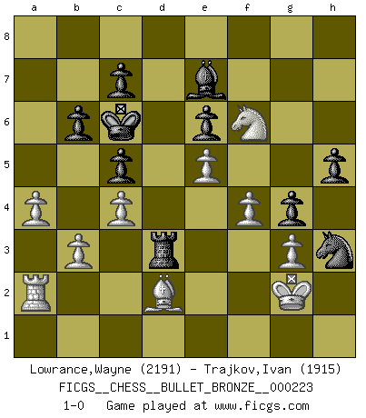 Last move : 1-0 2010 April 17 20:5:11 [Event "FICGS__CHESS__BULLET_BRONZE__000223"] [Site "FICGS"] [Date "2010.04.17"] [Round "1"] [White "Lowrance,Wayne"] [Black "Trajkov,Ivan"] [Result "1-0"] [WhiteElo "2191"] [BlackElo "1915"] 1.e4 e5 2.Nf3 Nc6 3.Bb5 Nf6 4.O-O Nxe4 5.d4 Nd6 6.Bxc6 dxc6 7.dxe5 Nf5 8.Qxd8+ Kxd8 9.Nc3 Ke8 10.h3 a5 11.Rd1 a4 12.a3 Be6 13.Bf4 Ne7 14.Ne4 Nd5 15.Bd2 Be7 16.Nd4 Nb6 17.Bc3 Rd8 18.Nxe6 fxe6 19.Rxd8+ Kxd8 20.Kf1 Nd5 21.Bd4 b6 22.c4 Nf4 23.g3 Nxh3 24.Be3 g5 25.Rd1+ Kc8 26.Kg2 g4 27.f4 c5 28.Nc3 h5 29.Nxa4 Kb7 30.Nc3 Kc6 31.a4 Ra8 32.b3 Re8 33.Ne4 Rf8 34.Bc1 Rf7 35.Kh2 Rf8 36.Rd2 Rf5 37.Rd3 Rf7 38.Kg2 Rf5 39.Be3 Rf7 40.Rd2 Rf8 41.Ra2 Ra8 42.Bc1 Rd8 43.Bd2 Rd3 44.Nf6 1-0 Ruy Lopez : Berlin defense, Open variation Kingside Castling by player White (move 4) Player White won this chess game. Follow this game move after move (download)The hardest game to win is a won game. (Emanuel Lasker) Ich organisiere ein großes Turnier, was mich etwa 120000 Dollar kostet. Ich denke, das ist das erste Mal in der Schachgeschichte, daß ein Schachgroßmeister auch als Mäzen auftritt. (Miguel Najdorf) La estratégia requiere pensar, la táctica requiere observación. (Max Euwe) Vous m'avez demandé de vous exposer quel est le fondement de la prière. Je ne fais que préparer les pièces du jeu sur la table... Nous sera-t-il permis d'en adopter les règles et si nous les appliquons scrupuleusement nous ne tarderons pas à faire mat le Roi divin ! Il ne pourra échapper à nos mains. (Sainte Thérèse d'Avila, Chemin de perfection) Statistics can be made to prove anything - even the truth. (Author unknown)