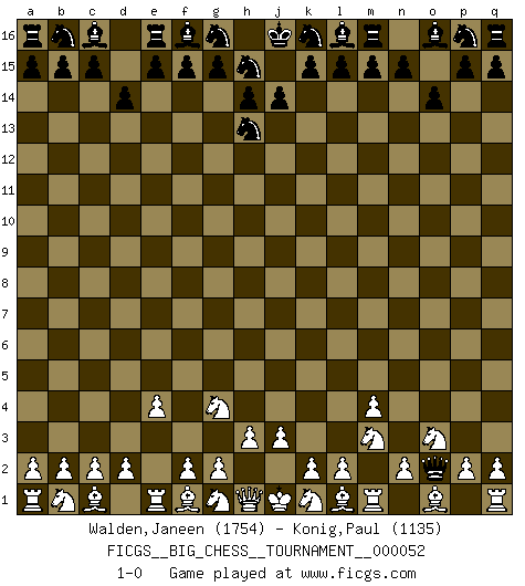 Last move : 1-0 2009 November 18 3:33:45 [Event "FICGS__BIG_CHESS__TOURNAMENT__000052"] [Site "FICGS"] [Date "2009.10.30"] [Round "1"] [White "Walden,Janeen"] [Black "Konig,Paul"] [Result "1-0"] [WhiteElo "1754"] [BlackElo "1135"] 1.j2-k4 o15-o14 2.h2-g4 j15-h13 3.m2-m4 h16-o10 4.e2-e4 o10-o2 5.p1-o3 d15-d14 6.k4-m3 1-0 Follow this game move after move (download)Chess is above all, a fight ! (Emanuel Lasker) Glücklicherweise sind Großmeister Ruben Fines reine Schachbücher weniger phallozentrisch [als seine Schachpsychologie] und deswegen auch weniger lächerlich. (Nigel Short) Antes de los Finales, los dioses han colocado el Juego Medio. (Siegbert Tarrasch) Les Echecs représentent une sphère d'idées créatrices basée sur la volonté des deux protagonistes. (Smyslov) The ego is not master in its own house. (Sigmund Freud)