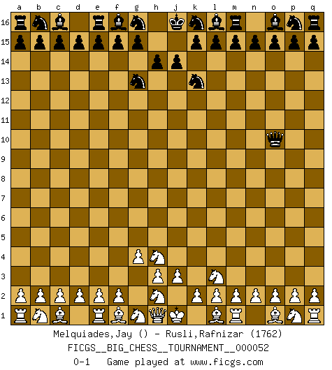 Last move : 0-1 2009 November 17 18:14:46 [Event "FICGS__BIG_CHESS__TOURNAMENT__000052"] [Site "FICGS"] [Date "2009.10.30"] [Round "1"] [White "Melquiades,Jay"] [Black "Rusli,Rafnizar"] [Result "0-1"] [WhiteElo ""] [BlackElo "1762"] 1.j2-h4 h15-g13 2.g2-g4 j15-k13 3.k1-l3 h16-o10 0-1 Follow this game move after move (download)Becoming successful at Chess allows you to discover your own personality. That's what I want for the kids I teach. (Saudin Robovic) Kleine Schachspieler machen Mist, und große Schachspieler machen Mist, aber große machen weniger Mist. (Fritz Sämisch) El Ajedrez es 99 por ciento táctica. (Teichmann) Il vaut toujours mieux jouer un plan faux de façon logique que de n'avoir pas de plan du tout. (Victor Kortchnoï) The mind is like a parachute, it only functions when its open. (Unknown)
