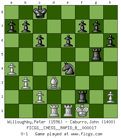 Last move : 0-1 2006 October 12 19:22:54 [Event "FICGS__CHESS__RAPID_B__000017"] [Site "FICGS"] [Date "2006.10.01"] [Round "1"] [White "Willoughby,Peter"] [Black "Caburro,John"] [Result "0-1"] [WhiteElo "1596"] [BlackElo "1400"] 1.e4 d5 2.exd5 Qxd5 3.Nc3 Qa5 4.d4 c6 5.Nf3 Nf6 6.Bc4 Bf5 7.O-O e6 8.Bd2 Qc7 9.Qc1 Bd6 10.g3 Bh3 11.Re1 Nbd7 12.Ng5 Bf5 13.a4 h6 14.Nge4 Nxe4 15.Nxe4 Bxe4 16.Rxe4 Nf6 17.Re1 O-O-O 18.Bf4 Bxf4 19.Qxf4 Qxf4 20.gxf4 Rxd4 21.b3 Rxf4 22.Rad1 Rd8 23.Bd3 Rd5 24.Bc4 Rg5+ 25.Kf1 Ne4 26.Bd3 Rxf2+ 0-1 Scandinavian (centre counter) defense Kingside Castling by player White (move 7) Queenside Castling by player Black (move 17) Player Black won this chess game. Follow this game move after move (download)The blunders are all there on the board, waiting to be made. (Savielly Tartakover) Charakterschwächen offenbaren sich normalerweise während einer Schachpartie. (Garry Kasparov) Las combinaciones han sido siempre el aspecto más intrigante del Ajedrez. Los Maestros las buscan, el público las aplauden, los críticos las alaban. La razón se debe a que las combinaciones hacen posible que el Ajedrez sea más que un ejercicio matemático con una carencia de vida. Ellas son la poesía del juego, son del Ajedrez lo que la melodía es de la música. Ellas representan el triunfo de la mente sobre la materia. (Reuben Fine) Donnez-moi un Cavalier en 6e et je gagnerais toutes mes parties. (Steinitz) Waiting for chance ? Play in casinos. (FICGS proverb)