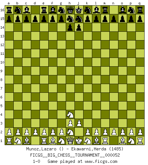 Last move : 1-0 2009 November 29 8:58:20 [Event "FICGS__BIG_CHESS__TOURNAMENT__000052"] [Site "FICGS"] [Date "2009.10.30"] [Round "1"] [White "Munoz,Lazaro"] [Black "Ekawarni,Herda"] [Result "1-0"] [WhiteElo ""] [BlackElo "1485"] 1.j2-h4 1-0 This big chess game has been lost on time (started : 2009.10.30 2:48:37) Follow this game move after move (download)You are for me the Queen on d8 and I am the Pawn on d7 !! (Eduard Gufeld) Ein Teil des Fehlers ist immer korrekt. (Savielly Grigorievitsch Tartakower) Si el Ajedrez es una ciencia, es la mas inexacta. Si el Ajedrez es un arte, es demasiado inexacto para ser visto como tal. Si el Ajedrez es un deporte, es demasiado esotérico. Si el Ajedrez es un juego, es demasiado exigente para ser solo un juego. Si el Ajedrez es una aventura, es una muy demandante. Si el Ajedrez es una pasión, es una muy gratificante. Si el Ajedrez es la vida, es una muy triste. (Anónimo) Karpov est une pièce de musée. (Garry Kasparov) Are you threatening me, Master Jedi ? (Chancellor Palpatine in Star Wars ep.3)