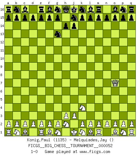 Last move : 1-0 2009 November 6 4:4:40 [Event "FICGS__BIG_CHESS__TOURNAMENT__000052"] [Site "FICGS"] [Date "2009.10.30"] [Round "1"] [White "Konig,Paul"] [Black "Melquiades,Jay"] [Result "1-0"] [WhiteElo "1135"] [BlackElo ""] 1.j2-k4 h15-g13 2.h1-o7 1-0 Follow this game move after move (download)Chess is the art which expresses the science of logic. (Mikhail Botvinnik) Lisa Lane, amerikanische Schachmeisterin, hatte Fischer einmal als stärksten lebenden Spieler bezeichnet. Antwort: Das ist richtig, aber Lisa Lane ist eigentlich nicht in der Lage, das zu beurteilen. (Robert James Fischer) Ciertamente, de todas la drogas del mundo, el Ajedrez debe ser el mas placentero permamentemente. (Assiac) Aidez vos pièces, elles vous aideront. (Paul Morphy) A good programmer is someone who always looks both ways before crossing a one-way street. (Doug Linder)