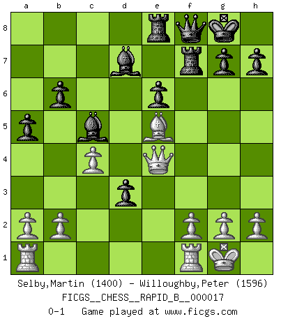Last move : 0-1 2006 December 3 16:53:49 [Event "FICGS__CHESS__RAPID_B__000017"] [Site "FICGS"] [Date "2006.10.01"] [Round "1"] [White "Selby,Martin"] [Black "Willoughby,Peter"] [Result "0-1"] [WhiteElo "1400"] [BlackElo "1596"] 1.e4 e6 2.e5 d5 3.d4 c5 4.Nf3 Nc6 5.dxc5 Bxc5 6.Bg5 f6 7.Bf4 Bd7 8.exf6 Nxf6 9.Bd3 O-O 10.O-O a5 11.Qe2 b6 12.Ne5 Nxe5 13.Bxe5 Rf7 14.Ba6 Qf8 15.Bb7 Re8 16.Nc3 d4 17.Nb5 Bxb5 18.c4 Bd7 19.Be4 Nxe4 20.Qxe4 d3 0-1 French : Steinitz attack Kingside Castling by player Black (move 9) Kingside Castling by player White (move 10) Player Black won this chess game. Follow this game move after move (download)The battle for the ultimate truth will never be won. And that's why Chess is so fascinating. (Hans Kmoch) Die starken Figuren des Gegners muss man abtauschen. (José Raúl Capablanca) El Ajedrez demanda una total concentración. (Bobby Fischer) Même si l'adversaire joue le coup analysé précédemment, recommencez l'analyse en voyant la nouvelle position. Première règle de Blumenfeld A good aphorism is too hard for the tooth of time, and is not worn away with the centuries, although it serves as food for every speech. (Friedrich Nietzsche)