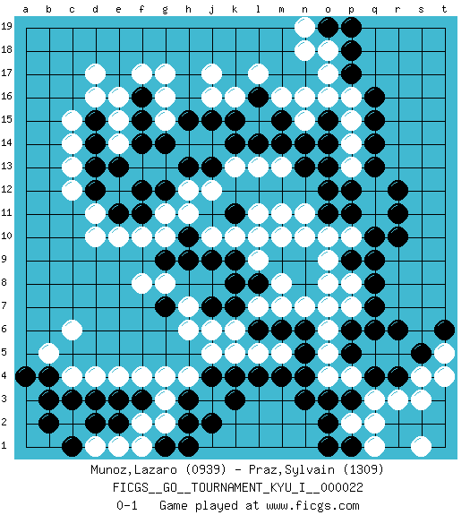 Last move : 0-1 2010 February 26 4:57:55 [Event "FICGS__GO__TOURNAMENT_KYU_I__000022"] [Site "FICGS"] [Date "2009.10.31"] [Round "1"] [Black "Munoz,Lazaro"] [White "Praz,Sylvain"] [Result "0-1"] [Rating 1 "0939"] [Rating 2 "1309"] 1.q16 d4 2.q4 d16 3.q10 o17 4.p17 o16 5.q14 k16 6.k4 d10 7.f3 c6 8.o14 p15 9.q15 p14 10.o13 p13 11.o12 d17 12.k14 l9 13.k11 m11 14.j9 o10 15.p11 q12 16.r12 q11 17.r11 p10 18.r10 m13 19.o15 p16 20.m14 l13 21.l14 m16 22.q8 o7 23.q6 k13 24.j13 j12 25.h13 h11 26.g12 g11 27.h15 c13 28.n4 r3 29.r4 q3 30.p3 p2 31.o2 q2 32.o3 s4 33.s5 s3 34.r6 j10 35.h9 k10 36.f15 g17 37.j15 h4 38.h3 f4 39.e3 e4 40.d3 j6 41.k8 l7 42.l8 m7 43.j7 h7 44.f11 f10 45.e11 e10 46.m9 m8 47.l10 m10 48.k9 l11 49.k7 k6 50.n9 o9 51.d13 c12 52.d12 d11 53.h10 l9 54.p12 l10 55.q13 j17 56.d15 c15 57.d14 c14 58.p18 o18 59.f16 f17 60.b4 c4 61.c3 b5 62.a4 s1 63.g7 g8 64.g9 f8 65.n13 h12 66.f12 g10 67.m6 h6 68.n8 n7 69.l6 j3 70.j4 g3 71.h2 g2 72.j2 j5 73.k3 d1 74.c1 f1 75.d2 e1 76.b2 p7 77.q7 o5 78.p5 o4 79.n5 o6 80.o19 n19 81.p19 n18 82.p9 p8 83.q9 p4 84.n3 e16 85.p6 g16 86.n6 o8 87.h1 g15 88.g14 n15 89.n14 k5 90.g1 f2 91.b3 e15 92.f14 e14 93.e13 l5 94.l4 m5 95.m4 t5 96.t6 t4 97.l16 l17 98.m15 n16 99.k15 l15 100.e2 g4 101.l16 j16 102.p1 q1 103.o1 n11 104.o11 n10 0-1 Here are the names of the openings (joseki) played in the four corners : Corner q16 : q16 o17 Hoshi (Hwajeom, Seongjeom, Xingwei`) 4-4 Point. The star or hoshi (4-4) point, emphasizing influence at the potential expense of territory. Ikken Kakari (Hankan Keolch'im, Yi Gua`jiao~, 1-Space Low Approach). White 2 is the standard approach move to the 4-4. Corner d4 : d4 f3 Hoshi (Hwajeom, Seongjeom, Xingwei`) 4-4 Point. The star or hoshi (4-4) point, emphasizing influence at the potential expense of territory. Ikken Kakari (Hankan Keolch'im, Yi Gua`jiao~, 1-Space Low Approach). Black 2 is the standard approach move to the 4-4. Corner q4 : q4 l9 Hoshi (Hwajeom, Seongjeom, Xingwei`) 4-4 Point. The star or hoshi (4-4) point, emphasizing influence at the potential expense of territory. Player White won this Go (weiqi, baduk) game. Follow this game move after move (download)Eyes win semiais. (Anonymous) Luck never gives; it only lends. (Swedish proverb)