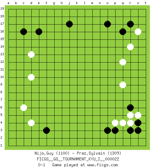 Last move : 0-1 2009 December 17 7:49:0 [Event "FICGS__GO__TOURNAMENT_KYU_I__000022 "] [Site "FICGS"] [Date "2009.10.31"] [Round "1"] [Black "Nijs,Guy "] [White "Praz,Sylvain "] [Result "0-1"] [Rating 1 "1100"] [Rating 2 "1309"] 1.q16 q4 2.c16 d4 3.j17 d13 4.e16 d10 5.r6 q9 6.r3 r4 7.s4 s5 8.s3 r5 9.p3 p4 10.o3 r14 11.o17 s16 12.r17 q12 13.f3 c6 0-1 This go game has been lost on time (started : 2009.10.31 20:50:16) Here are the names of the openings (joseki) played in the four corners : Corner q4 : q4 r6Hoshi (Hwajeom, Seongjeom, Xingwei`) 4-4 Point. The star or hoshi (4-4) point, emphasizing influence at the potential expense of territory.Ikken Kakari (Hankan Keolch'im, Yi Gua`jiao~, 1-Space Low Approach). Black 2 is the standard approach move to the 4-4. Corner q16 : q16 r14Hoshi (Hwajeom, Seongjeom, Xingwei`) 4-4 Point. The star or hoshi (4-4) point, emphasizing influence at the potential expense of territory.Ikken Kakari (Hankan Keolch'im, Yi Gua`jiao~, 1-Space Low Approach). White 2 is the standard approach move to the 4-4. Corner d4 : d4 f3Hoshi (Hwajeom, Seongjeom, Xingwei`) 4-4 Point. The star or hoshi (4-4) point, emphasizing influence at the potential expense of territory.Ikken Kakari (Hankan Keolch'im, Yi Gua`jiao~, 1-Space Low Approach). Black 2 is the standard approach move to the 4-4. Player White won this Go (weiqi, baduk) game.Follow this game move after move (download ) A basic: Don't push too hard. (Jansteen) Plans are ideas that never come to fruition. (Daniel Parmet)