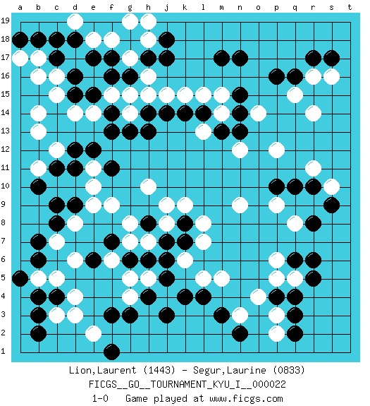 Last move : 1-0 2010 March 19 0:48:3 [Event "FICGS__GO__TOURNAMENT_KYU_I__000022"] [Site "FICGS"] [Date "2009.10.31"] [Round "1"] [Black "Lion,Laurent"] [White "Segur,Laurine"] [Result "1-0"] [Rating 1 "1443"] [Rating 2 "0833"] 1.q16 d3 2.q4 d17 3.d15 c12 4.f16 e16 5.e15 f18 6.h17 g17 7.g16 r14 8.c17 e18 9.f17 g19 10.e17 h19 11.j18 d19 12.c18 h18 13.j17 b14 14.d16 d8 15.q10 r11 16.r10 q15 17.p16 o14 18.n15 r16 19.r17 s16 20.s17 p12 21.j3 m5 22.q6 p9 23.p10 q8 24.r8 n9 25.m13 n12 26.e12 q5 27.r5 p5 28.p4 p6 29.r6 o4 30.f3 g4 31.g3 p3 32.q3 p2 33.q2 s10 34.s9 d14 35.f14 m14 36.n14 l13 37.l14 m15 38.n13 l15 39.k14 k15 40.j14 j15 41.h14 h15 42.n17 g14 43.g13 h16 44.m17 g15 45.h13 f15 46.d18 e14 47.f13 c16 48.h4 h5 49.j5 g5 50.n2 n3 51.m3 k6 52.j6 k9 53.c11 b11 54.d11 c15 55.b10 b17 56.b18 a17 57.a18 b16 58.c9 d6 59.c4 c3 60.b6 c7 61.b7 f9 62.b3 d4 63.b2 c5 64.b4 b5 65.a5 h10 66.l4 l5 67.k4 e2 68.f1 h7 69.c8 e11 70.f11 e10 71.d9 e9 72.d12 b13 73.j7 j8 74.k7 l7 75.k8 l8 76.h8 j9 77.h6 g7 78.g6 f6 79.f7 g8 80.e6 1-0 Here are the names of the openings (joseki) played in the four corners : Corner d16 : d17 d15 Komoku (Somok, Xiao~mu`) 3-4 Point. The komoku (3-4) point is the traditional corner enclosure move.. Ikken Takagakari (Hankan Nop'dakeolch'im, Yi Gaogua`jiao~, 1-Space High Approach). The 5-4 approach move has become more popular in modern times, as modern Go emphasizes speed and influence. Corner q16 : q16 r14 Hoshi (Hwajeom, Seongjeom, Xingwei`) 4-4 Point. The star or hoshi (4-4) point, emphasizing influence at the potential expense of territory. Ikken Kakari (Hankan Keolch'im, Yi Gua`jiao~, 1-Space Low Approach). White 2 is the standard approach move to the 4-4. Corner q4 : q4 m5 Hoshi (Hwajeom, Seongjeom, Xingwei`) 4-4 Point. The star or hoshi (4-4) point, emphasizing influence at the potential expense of territory. Player Black won this Go (weiqi, baduk) game. Follow this game move after move (download)White is always trying to kill a bigger group than black is trying to save. (Anonymous) There is a computer disease that anybody who works with computers knows about. It's a very serious disease and it interferes completely with the work. The trouble with computers is that you 'play' with them ! (Richard P. Feynman)